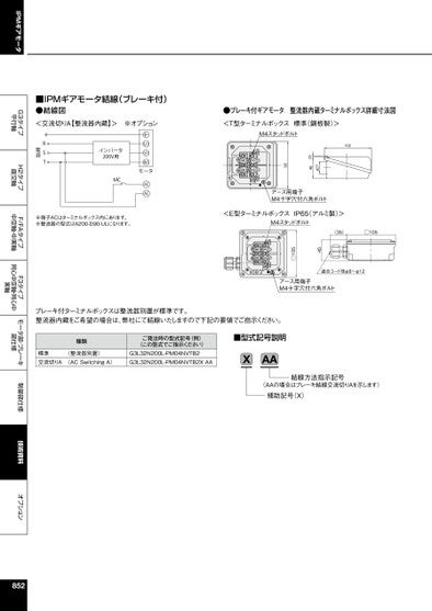 IPMギアモータG3タイプ平行軸H2タイプ直交軸F/FAタイプ中空軸・中実軸F3タイプ同心中空軸・同心中実軸モータ部・ブレーキ部仕様制御部仕様技術資料オプション■IPMギアモータ結線(ブレーキ付)●結線図●ブレーキ付ギアモータ整流器内蔵ターミナルボックス詳細寸法図<交流切りA【整流器内蔵】>※オプション<T型ターミナルボックス標準(鋼板製)>M4スタッドボルト102φ2746(3)92B2B1U1V1W1アース用端子M4十字穴付六角ボルト<E型ターミナルボックスIP65(アルミ製)>M4スタッドボルト(35)□105適合コード径φ8~φ12アース用端子M4十字穴付六角ボルト45□105B2B1U1V1W1E-BOXインバータ200V用MCU1V1W1モータACACRST電源※端子ACはターミナルボックス内にあります。※整流器の型式はA200-D90-ULになります。ブレーキ付ターミナルボックスは整流器別置が標準です。整流器内蔵をご希望の場合は、弊社にて結線いたしますので下記の要領でご指示ください。種類ご発注時の型式記号(例)(この型式でご指示ください)■型式記号説明標準交流切りA(ACSwitchingA)(整流器別置)G3L32N200L-PM04NVTB2G3L32N200L-PM04NVTB2XAAXAA結線方法指示記号(AAの場合はブレーキ結線交流切りAを示します)補助記号(X)852
