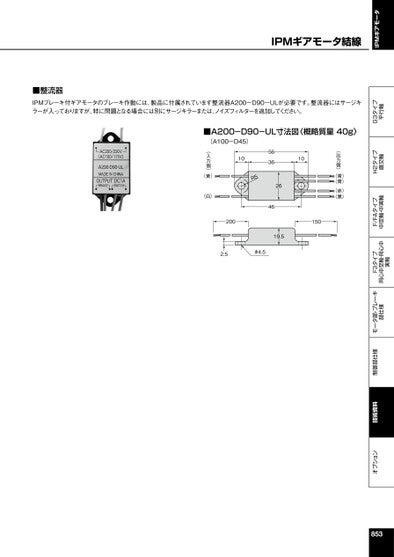 IPMギアモータオプション技術資料制御部仕様モータ部・ブレーキ部仕様F3タイプ同心中空軸・同心中実軸F/FAタイプ中空軸・中実軸H2タイプ直交軸G3タイプ平行軸853■A200-D90-UL寸法図〈概略質量40g〉(A100-D45)〈出力側〉(青)(青)(赤)(黒)105R1056364626〈入力側〉(黄)(白)20015019.52.5φ4.5■整流器IPMブレーキ付ギアモータのブレーキ作動には、製品に付属されています整流器A200-D90-ULが必要です。整流器にはサージキラーが入っておりますが、特に問題となる場合には別にサージキラーまたは、ノイズフィルターを追加してください。
