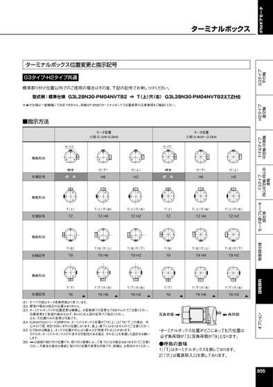 IPMギアモータオプション技術資料制御部仕様モータ部・ブレーキ部仕様F3タイプ同心中空軸・同心中実軸F/FAタイプ中空軸・中実軸H2タイプ直交軸G3タイプ平行軸ターミナルボックス位置変更と指示記号G3タイプ・H2タイプ共通標準取り付け位置以外でのご使用の場合はその旨、下記の記号でお申しつけください。型式例:標準仕様G3L28N30-PM04NVTB2⇒T(上)穴(右)G3L28N30-PM04NVTB2XTZH6※▲の仕様は一部機種にて対応できません。詳細はP.858のターミナルボックス位置変更の注意事項をご確認ください。■指示方法概略形状仕様記号概略形状仕様記号概略形状仕様記号概略形状仕様記号モータ容量三相0.1kW・0.2kWモータ容量三相0.4kW~2.2kWボックス標準標準ボックス標準標準穴(下)H6穴(上)HZ穴(下)H6穴(上)HZT(上)TZT(上)穴(右)T上)穴(左)TZH6TZHZT上)TZT(上)穴(右)T上)穴(左)TZH6TZHZT(左)T9T左)穴(上)T左)穴(下)T9H6T9HZT左)T9T(左)穴(上)T左)穴(下)T9H6T9HZT(下)T6T下)穴(左)T下)穴(右)▲T6H6▲T6HZ▲T下)T6T(下)穴(左)T下)穴(右)▲T6H6▲T6HZ▲注1.すべての図はモータ反負荷側より見ています。注2.標準の場合は指示の必要はありません。注3.ターミナルボックスの位置変更は機構上、お客様側での変更はできませんのでご注意ください。位置変更をご希望の場合は必ず、あらかじめ上図の記号でご指示ください。なお、穴位置のみの変更は可能です。注4.0.2kWのG3シリーズ28枠のみ、ターミナルボックス位置が「TZ上)」と「T6(下)」の場合、中心から17度、時計方向にずれた位置になります。真上・真下にはなりませんのでご注意ください。注5.0.75kWは構造上、ボックス位置が中心より最大±2°程度ずれることがあります。そのため、ターミナルボックスが干渉する可能性がある場合、ずれることを考慮した設計をお願いします。は銘板の貼り付け位置です。取り付け姿勢によって見づらくなる場合もありますのでご注意ください。不都合な場合は事前に貼り付け位置の変更も可能です。詳細は、お問合わせください。注6.反負荷側負荷側・ターミナルボックス位置がどこにあっても穴位置は必ず負荷側が「3」反負荷側が「9」となります。●呼称の意味1)T」はターミナルボックスを表しております。2)穴」は電源取入口を表しております。855