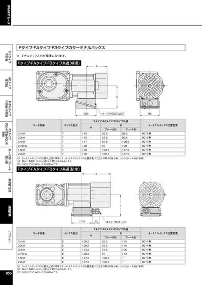 IPMギアモータG3タイプ平行軸H2タイプ直交軸F/FAタイプ中空軸・中実軸F3タイプ同心中空軸・同心中実軸モータ部・ブレーキ部仕様制御部仕様技術資料オプションFタイプ・FAタイプ・F3タイプのターミナルボックスターミナルボックス付が標準になります。Fタイプ・FAタイプ・F3タイプ共通(標準)BA102ケーブル引込口φ2796Fタイプ・FAタイプ・F3タイプ共通モータ容量ボックス型式ABターミナルボックス位置変更ブレーキなしブレーキ付0.1kW0.2kW0.4kW0.75kW1.5kW2.2kWTTTTTT11011011712813913953.553.554.557108.5108.592.592.5105.5108137.5137.590°分割90°分割90°分割90°分割90°分割90°分割注1.ターミナルボックスの位置は上図が標準です。ターミナルボックスの位置変更はご注文の際その旨お申しつけください。P.857参照注2.図は代表図によりモータ形状が異なるものもあります。注3.FAタイプは0.4kW〜2.2kWのみです。Fタイプ・FAタイプ・F3タイプ共通(防水)BAモータ容量ボックス型式0.1kW0.2kW0.4kW0.75kW1.5kW2.2kWEEEEEE□10535適合コード径φ8~φ12Fタイプ・FAタイプ・F3タイプ共通A108.2108.2115.2126.2137.2137.2Bターミナルボックス位置変更ブレーキなしブレーキ付53.553.554.557108.5108.5115115105113──90°分割90°分割90°分割90°分割90°分割90°分割注1.ターミナルボックスの位置は上図が標準です。ターミナルボックスの位置変更はご注文の際その旨お申しつけください。P.857参照注2.図は代表図によりモータ形状が異なるものもあります。注3.FAタイプは0.4kW〜2.2kWのみです。856