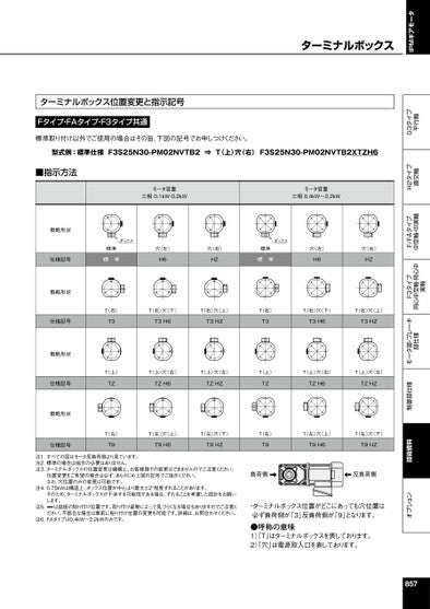 IPMギアモータオプション技術資料制御部仕様モータ部・ブレーキ部仕様F3タイプ同心中空軸・同心中実軸F/FAタイプ中空軸・中実軸H2タイプ直交軸G3タイプ平行軸ターミナルボックス位置変更と指示記号Fタイプ・FAタイプ・F3タイプ共通標準取り付け以外でご使用の場合はその旨、下図の記号でお申しつけください。型式例:標準仕様F3S25N30-PM02NVTB2⇒T(上)穴(右)F3S25N30-PM02NVTB2XTZH6■指示方法概略形状仕様記号概略形状仕様記号概略形状仕様記号概略形状仕様記号モータ容量三相0.1kW・0.2kWモータ容量三相0.4kW~2.2kWボックス標準標準穴(左)H6穴(右)HZボックス標準標準穴(左)H6穴(右)HZT(右)T3T右)穴(下)T(右)穴(上)T3H6T3HZT(右)T3T(右)穴(下)T(右)穴(上)T3H6T3HZT(上)TZT上)穴(右)T(上)穴(左)TZH6TZHZT(上)TZT(上)穴(右)T(上)穴(左)TZH6TZHZT(左)T9T左)穴(上)T(左)穴(下)T9H6T9HZT(左)T9T(左)穴(上)T(左)穴(下)T9H6T9HZ注1.すべての図はモータ反負荷側より見ています。注2.標準の場合は指示の必要はありません。注3.ターミナルボックスの位置変更は機構上、お客様側での変更はできませんのでご注意ください。位置変更をご希望の場合は必ず、あらかじめ上図の記号でご指示ください。なお、穴位置のみの変更は可能です。注4.0.75kWは構造上、ボックス位置が中心より最大±2°程度ずれることがあります。そのため、ターミナルボックスが干渉する可能性がある場合、ずれることを考慮した設計をお願いします。は銘板の貼り付け位置です。取り付け姿勢によって見づらくなる場合もありますのでご注意ください。不都合な場合は事前に貼り付け位置の変更も可能です。詳細は、お問合わせください。注5.注6.FAタイプは0.4kW〜2.2kWのみです。負荷側反負荷側・ターミナルボックス位置がどこにあっても穴位置は必ず負荷側が「3」反負荷側が「9」となります。●呼称の意味1)T」はターミナルボックスを表しております。2)穴」は電源取入口を表しております。857