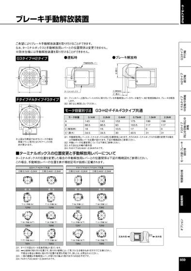 IPMギアモータオプション技術資料制御部仕様モータ部・ブレーキ部仕様F3タイプ同心中空軸・同心中実軸F/FAタイプ中空軸・中実軸H2タイプ直交軸G3タイプ平行軸Fタイプ・FAタイプ・F3タイプ※上図は代表図でありF3シリーズの場合両面フランジ取付となりギアヘッドの形状が異なります。注1.ファンカバー上部のレバートメガネに取り付いている手動解放レバーをモータ後方へ、60°程度回転させ、ブレーキを解放します。注2.90°以上解放しないでください。モータ容量別寸法G3・H2・F・FA・F3タイプ共通モータ容量0.1kW0.2kW0.4kW0.75kW1.5kW2.2kWABC(解放時)C'(最大)14386.51634.514386.51634.51539310.530175103.51740.5199117031199117031注1.手動解放用レバーとターミナルボックスは同じ位置関係にあります。そのためターミナルボックスの位置を変更する場合は手動解放用レバーも位置が変わります。下記の概略図をご参照ください。注2.手動レバーの位置変更については下表をご参照ください。注3.A寸法は止め輪の最外径注4.FAタイプは0.4kW〜2.2kWのみです。■ターミナルボックスの位置変更と手動解放用レバーについてターミナルボックスの位置を変更した場合の手動解放用レバーとの位置関係は下記の概略図をご参照ください。この場合、手動解放レバーの位置を表す補助記号が銘板に記載されます。G3タイプ・H2タイプ共通Fタイプ・FAタイプ・F3タイプ共通三相0.1kW~0.2kW三相0.4kW~2.2kW三相0.1kW~0.2kW三相0.4kW~2.2kW標準標準標準標準T(上)手動(左)T(上)手動(左)T(右)手動(上)T(右)手動(上)TZR9TZR9T3RZT3RZT左)手動(右下)T(左)手動(下)T上)手動(左下)T(上)手動(左)T9R4T9R6TZR7TZR9T下)手動(右上)T(下)手動(右)T左)手動(右下)T(左)手動(下)T6R1T6R3T9R4T9R6反負荷側負荷側注1.すべての図はモータ反負荷側より見ています。注2.は銘板の貼り付け位置です。取り付け姿勢によって見づらくなる場合もありますのでご注意ください。不都合な場合は事前に貼り付け位置の変更も可能です。詳しくは、お問合わせください。注3.一部の機種は手動解放レバーが取り付け面より飛び出すため対応不可です。注4.FAタイプは0.4kW〜2.2kWのみです。859ご希望によりブレーキ手動解放装置を取り付けることができます。なお、ターミナルボックスと手動解放用レバーとの位置関係は変更できません。※防水仕様には手動解放装置を取り付けることができません。G3タイプ・H2タイプ●運転時●ブレーキ解放時手動解放用レバー(最大)BC(解放時)C'(最大)Aターミナルボックスブレーキ手動解放装置