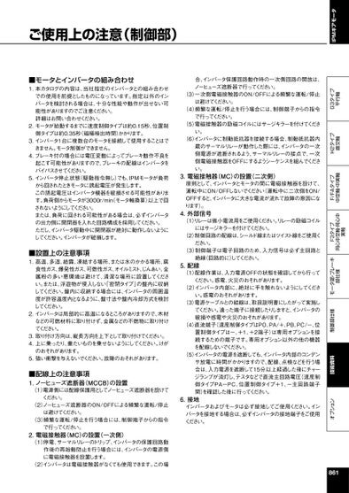 IPMギアモータオプション技術資料制御部仕様モータ部・ブレーキ部仕様F3タイプ同心中空軸・同心中実軸F/FAタイプ中空軸・中実軸H2タイプ直交軸G3タイプ平行軸ご使用上の注意(制御部)■モータとインバータの組み合わせ1.本カタログの内容は、当社指定のインバータとの組み合わせでの使用を前提としたものになっています。指定以外のインバータを検討される場合は、十分な性能や動作が出せない可能性がありますのでご注意ください。詳細はお問い合わせください。2.モータが始動するまでに速度制御タイプは約0.15秒、位置制御タイプは約0.35秒(磁極検出時間)かかります。3.インバータ1台に複数台のモータを接続して使用することはできません。モータ制御ができません。4.ブレーキ付の場合には電圧変動によってブレーキ動作不良を起こす可能性がありますので、ブレーキの配線はインバータをバイパスさせてください。5.インバータ停止状態(駆動指令無し)でも、IPMモータが負荷から回されたときモータに誘起電圧が発生します。この誘起電圧はインバータ機器を破損させる可能性があります。負荷側からモータが3000r/minモータ軸換算)以上で回されないようにしてください。または、負荷に回される可能性がある場合は、必ずインバータの出力側に開閉器を入れた回路構成を採用してください。ただし、インバータ駆動中に開閉器が絶対に動作しないようにしてください。インバータが破損します。■設置上の注意事項1.高温、多湿、結露、凍結する場所、または水のかかる場所、腐食性ガス、爆発性ガス、可燃性ガス、オイルミスト、じんあい、金属粉の多い悪環境は避けて、清潔な場所に設置してください。または、浮遊物が侵入しない「密閉タイプ」の盤内に収納してください。盤内に収納する場合には、インバータの周囲温度が許容温度内となるように、盤寸法や盤内冷却方式を検討してください。2.インバータは局部的に高温になるところがありますので、木材などの可燃材料に取り付けず、金属などの不燃物に取り付けてください。3.取り付け方向は、縦長方向を上下として取り付けてください。4.上に乗ったり、重たいものを乗せないようにしてください。けがのおそれがあります。5.強い衝撃を与えないでください。故障のおそれがあります。■配線上の注意事項1.ノーヒューズ遮断器(MCCB)の設置(1)電源側には配線保護用としてノーヒューズ遮断器を設けてください。(2)ノーヒューズ遮断器のON/OFFによる頻繁な運転/停止は避けてください。(3)頻繁な運転/停止を行う場合には、制御端子からの指令で行ってください。2.電磁接触器(MC)の設置(一次側)(1)停電、サーマルリレーのトリップ、インバータの保護回路動作後の再始動防止を行う場合には、インバータの電源側に電磁接触器を設置します。合、インバータ保護回路動作時の一次側回路の開放は、ノーヒューズ遮断器で行ってください。(3)一次側電磁接触器のON/OFFによる頻繁な運転/停止は避けてください。(4)頻繁な運転/停止を行う場合には、制御端子からの指令で行ってください。(5)電磁接触器の励磁コイルにはサージキラーを付けてください。(6)インバータに制動抵抗器を接続する場合、制動抵抗器内蔵のサーマルリレーが動作した際には、インバータの一次側電源が遮断されるよう、サーマルリレーの接点で、一次側電磁接触器をOFFにするようシーケンスを組んでください。3.電磁接触器(MC)の設置(二次側)原則として、インバータとモータの間に電磁接触器を設けて、運転中にON/OFFしないでください(運転中に二次側をON/OFFすると、インバータに大きな電流が流れて故障の原因になります)。4.外部信号(1)リレーは微小電流用をご使用ください。リレーの励磁コイルにはサージキラーを付けてください。(2)制御回路の配線は、シールド線またはツイスト線をご使用ください。(3)制御端子は電子回路のため、入力信号は必ず主回路と絶縁(回路的に)してください。5.配線(1)配線作業は、入力電源OFFの状態を確認してから行ってください。感電、火災のおそれがあります。(2)インバータ内部に、絶対に手を触れないようにしてください。感電のおそれがあります。(3)電源ケーブルとの結線は、取扱説明書にしたがって実施してください。違った端子に接続したりしますと、インバータの破損や感電や火災のおそれがあります。(4)直流端子(速度制御タイプはPO、PA/+、PB、PC/-、位置制御タイプは-、+1、+2端子)は専用オプションを接続するための端子です。専用オプション以外の他の機器を配線しないでください。(5)インバータの電源を遮断しても、インバータ内部のコンデンサ放電に時間がかかりますので、配線、点検などを行う場合は、入力電源を遮断して15分以上経過した後にチャージランプが消灯し、テスタなどで直流主回路電圧(速度制御タイプPA-PC、位置制御タイプ+1、-主回路端子間)を確認した後に行ってください。6.接地インバータおよびモータは必ず接地してご使用く