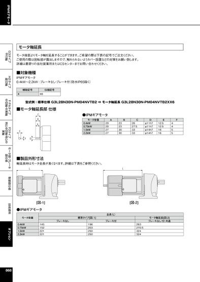 G3タイプ平行軸H2タイプ直交軸F/FAタイプ中空軸・中実軸F3タイプ同心中空軸・同心中実軸モータ部・ブレーキ部仕様制御部仕様技術資料オプションIPMギアモータモータ軸延長モータ後部よりモータ軸を延長することができます。ご希望の際は下表の記号でご注文ください。ご使用の際は回転部が露出しますので、触れられないようカバー設置などの対策をお願い致します。詳細は最寄りの当社営業所またはCSセンターまでお問い合わせください。■対象機種IPMギアモータ0.4kW〜2.2kW:ブレーキなし・ブレーキ付(防水IP65除く)補助記号仕様記号XX6型式例:標準仕様G3L28N30N-PM04NVTB2⇒モータ軸延長G3L28N30N-PM04NVTB2XX6■モータ軸延長部仕様CBAEFD●IPMギアモータモータ容量0.4kW0.75kW1.5kW2.2kWA20202727B23233030C2627.53333Dφ11h7φ11h7φ14h7φ14h7E12.512.51616F4455■製品外形寸法軸延長時はモータ全長が長くなります。詳細は下表をご参照ください。LL[図-1]●IPMギアモータモータ容量0.4kW0.75kW1.5kW2.2kW145152221221全長(L)ブレーキ付ブレーキなし標準タイプ[図-1]196203250250[図-2]263270.5324324モータ軸延長[図-2]ブレーキなし/付共通868