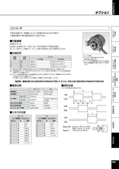 オプション技術資料制御部仕様モータ部・ブレーキ部仕様F3タイプ同心中空軸・同心中実軸F/FAタイプ中空軸・中実軸H2タイプ直交軸G3タイプ平行軸IPMギアモータエンコーダ下記の仕様でモータ後部にエンコーダを取り付けることができます。ご希望の際は下表の型式記号でご注文ください。■対象機種IPMギアモータ0.1kW〜2.2kWブレーキなし・ブレーキ付(防水タイプIP65は除く)注1.ブレーキ部のギャップ調整やブレーキユニット交換が必要な際は、当社での修理対応になります。■仕様記号補助記号仕様記号XXXX0X1X2100p/r1024p/r1024p/rパルス数スペック出力方式A/B/Z、ラインドライバA/B/Z、ラインドライバA/B/Z、オープンコレクタエンコーダ外観※ファンカバー内部に組み付けるため製品外観上見えません。※エンコーダの保護構造はIP50です。製品銘板上の保護構造とは異なりますのでご注意ください。注1.表以外の仕様をご希望される場合は、特注にて対応可能な場合もありますのでご相談ください。注2.お客様自身でエンコーダを取り付けるなどのために、エンコーダ取付け用の軸とマウントのみの仕様も製作注3.エンコーダと軸は緩み防止のため接着剤付の止めねじで固定されております。接着剤を付けずに出荷する可能ですのでご相談ください。ことも可能ですのでご相談ください。その場合、止めねじが緩まないようお客様にて処置または対応をお願いいたします。型式例:標準仕様G3L28N30N-PM04NVTB2⇒エンコーダ付G3L28N30N-PM04NVTB2XX0■電気仕様電源電圧消費電流出力電圧HレベルLレベル最大引き込み電流最大応答周波数立上がり、立下り時間■コネクタ仕様X0/X1X0/X1DC4.5〜13.2V30mAMAX2.5V以上0.5V以下20mA120kHz100nsMAXX2DC4.5〜30V30mAMAX-0.5V以下(最大引き込み時)40mA120kHz1μsMAXX2ヒロセ電機製:DF3-9S-2C接続色ヒロセ電機製:DF3-6S-2C接続色端子No.123456789赤黒緑青白灰黄橙黒Vcc0VSigASigASigBSigBSigZSigZシールド端子No.123456赤黒青白黄黒Vcc0VSigASigBSigZシールド■波形仕様※モータが逆転時の波形となります。PA相A相B相B相Z相Z相abcdhSignalA,BSignalZa,b,c,d=(P/4)±(P/8)Duty=(P/2)±(P/4)(P/4)≦h≦(3P/4)869