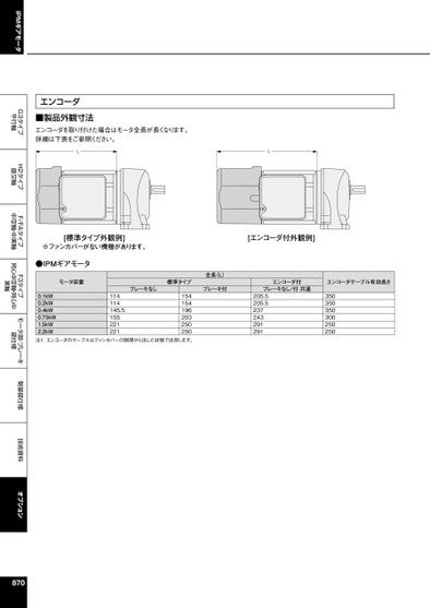 G3タイプ平行軸H2タイプ直交軸F/FAタイプ中空軸・中実軸F3タイプ同心中空軸・同心中実軸モータ部・ブレーキ部仕様制御部仕様技術資料オプションIPMギアモータエンコーダ■製品外観寸法エンコーダを取り付けた場合はモータ全長が長くなります。詳細は下表をご参照ください。LL[標準タイプ外観例]※ファンカバーがない機種があります。[エンコーダ付外観例]エンコーダ付ブレーキなし/付共通205.5205.5237243291291エンコーダケーブル有効長さ350350350300250250●IPMギアモータモータ容量0.1kW0.2kW0.4kW0.75kW1.5kW2.2kW全長(L)ブレーキ付ブレーキなし114114145.5155221221標準タイプ154154196203250250注1.エンコーダのケーブルはファンカバーの隙間から出した状態で出荷します。870