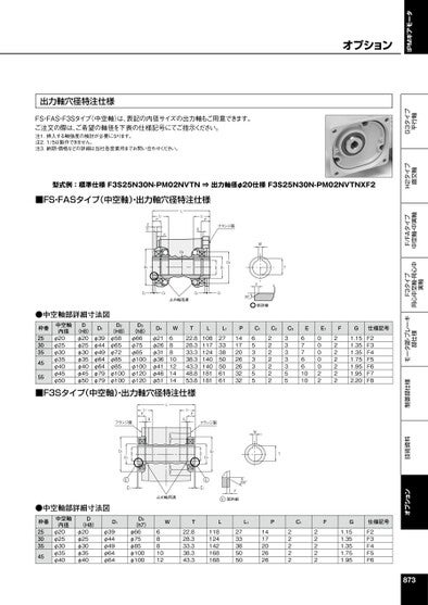 オプション技術資料制御部仕様モータ部・ブレーキ部仕様F3タイプ同心中空軸・同心中実軸F/FAタイプ中空軸・中実軸H2タイプ直交軸G3タイプ平行軸IPMギアモータ型式例:標準仕様F3S25N30N-PM02NVTN⇒出力軸径φ20仕様F3S25N30N-PM02NVTNXF2■FS・FASタイプ(中空軸)・出力軸穴径特注仕様D3D2DD1TL1PGフランジ面WLD4L1PG1EEC2C3C3C1止め輪用溝F30°部詳細●中空軸部詳細寸法図出力軸穴径特注仕様FS・FAS・F3Sタイプ(中空軸)は、表記の内径サイズの出力軸もご用意できます。ご注文の際は、ご希望の軸径を下表の仕様記号にてご指示ください。注1.挿入する軸強度の検討が必要になります。注2.1/5は製作できません。注3.納期・価格などの詳細は当社各営業所までお問い合わせください。枠番2530354555中空軸内径φ20φ25φ30φ35φ40φ45φ50D(H8)φ20φ25φ30φ35φ40φ45φ50D1φ39φ44φ49φ64φ64φ79φ79D2(H8)φ58φ65φ72φ85φ85φ100φ100D3(h8)φ66φ75φ85φ100φ100φ120φ120D4φ21φ26φ31φ36φ41φ46φ51WT6881012141422.828.333.338.343.348.853.8L108117124140140181181■F3Sタイプ(中空軸)・出力軸穴径特注仕様LL1PGフランジ面L1PGフランジ面L1PC1C2C3EE1FG仕様記号22222223333355677661010000002222222221.151.351.351.751.951.952.20F2F3F4F5F6F7F827333850506161141720262632326533355WD2DD1EC1●中空軸部詳細寸法図枠番25303545中空軸内径φ20φ25φ30φ35φ40D(H8)φ20φ25φ30φ35φ40D1φ39φ44φ49φ64φ64D2(h7)φ66φ75φ85φ100φ100TD2DD1EC130°FE部詳細LL1PC1FG仕様記号1181241421681682733385050141720262622222222221.151.351.351.751.95F2F3F4F5F6873止め輪用溝W6881012T22.828.333.338.343.3