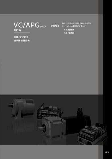 VG/APGタイプ平行軸P.880BATTERYPOWEREDGEARMOTOR1.バッテリー電源ギアモータ1-1.性能表1-2.寸法図機種・型式記号標準機種構成表875