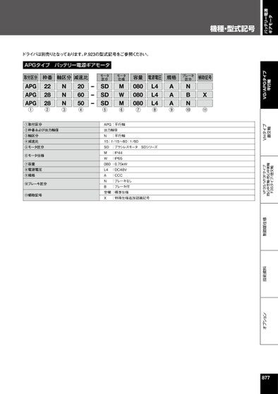 オプション技術資料制御部仕様VF3S/VF3Fタイプ同心中空軸・同心中実軸F3Sタイプ/直交軸VHタイプ直交軸VG/APGタイプ平行軸機種・型式記号バッテリー電源ギアモータ877電源電圧規格ブレーキ区分補助記号X⑪NBN⑩AAA⑨L4L4L4⑧容量080080080⑦モータ仕様MWM⑥モータ区分SDSDSD⑤取付区分枠番軸区分減速比206050④NNN③APGAPGAPG①222828②ドライバは別売りとなっております。P.923の型式記号をご参照ください。APGタイプバッテリー電源ギアモータ①取付区分②枠番および出力軸径③軸区分④減速比⑤モータ区分⑥モータ仕様⑦容量⑧電源電圧⑨規格⑩ブレーキ区分⑪補助記号:平行軸:IP44:IP65APG:平行軸出力軸径N15:1/15~60:1/60SD:ブラシレスモータSDシリーズMW080:0.75kW:DC48VL4A:CCC:ブレーキなしNB:ブレーキ付空欄:標準仕様X:特殊仕様追加認識記号