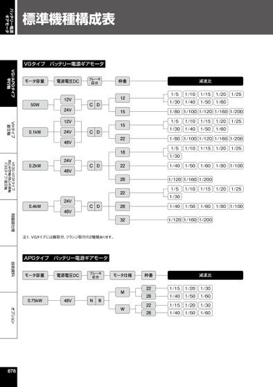 VG/APGタイプ平行軸VHタイプ直交軸VF3S/VF3Fタイプ同心中空軸・同心中実軸F3Sタイプ/直交軸制御部仕様技術資料オプションバッテリー電源ギアモータ標準機種構成表VGタイプバッテリー電源ギアモータモータ容量電源電圧DCブレーキ区分枠番減速比50W0.1kW0.2kW0.4kW12V24V12V24V48V24V48V24V48VCDCDCDCD12151522182228222832注1.VGタイプには脚取付、フランジ取付の2種類あります。APGタイプバッテリー電源ギアモータ1/51/301/101/401/151/501/201/601/251/801/1001/1201/1601/2001/51/301/101/401/151/501/201/601/251/801/1001/1201/1601/2001/101/151/201/251/51/301/401/501/601/801/1001/1201/1601/2001/101/151/201/251/51/301/401/501/601/801/1001/1201/1601/200モータ容量電源電圧DCブレーキ区分モータ仕様枠番減速比0.75kW48VNBMW222822281/151/401/151/401/201/501/201/501/301/601/301/60878