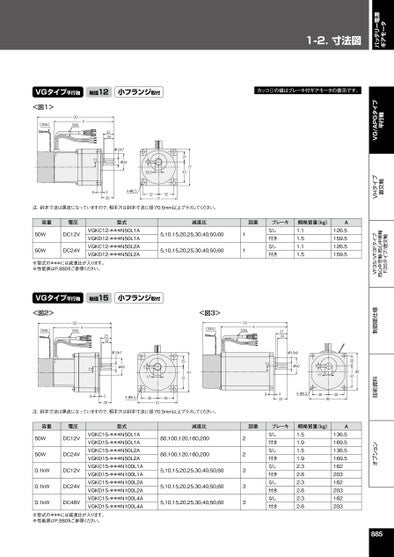 オプション技術資料制御部仕様VF3S/VF3Fタイプ同心中空軸・同心中実軸F3Sタイプ/直交軸VHタイプ直交軸VG/APGタイプ平行軸1-2.寸法図バッテリー電源ギアモータVGタイプ平行軸軸径12小フランジ取付カッコ()の値はブレーキ付ギアモータの表示です。<図1>(300L)(A)500LA2220φ12h7φ3511413.521437783264-φ6.5323277注.斜字寸法は黒皮になっていますので、相手穴は斜字寸法に径で0.5mm以上プラスしてください。容量電圧型式減速比図番ブレーキ50W50WDC12VDC24VVGKC12-***N50L1AVGKD12-***N50L1AVGKC12-***N50L2AVGKD12-***N50L2A※型式の***には減速比が入ります。※性能表はP.880をご参照ください。5,10,15,20,25,30,40,50,605,10,15,20,25,30,40,50,6011なし付きなし付き概略質量(kg)1.11.51.11.5A126.5159.5126.5159.5VGタイプ平行軸軸径15小フランジ取付<図2>(300L)(A)500LA<図3>(300L)(A)500LA2522φ15h7φ405172551913294-φ6.53838911392724φ15h6φ405172590514-φ6.5433389038139注.斜字寸法は黒皮になっていますので、相手穴は斜字寸法に径で0.5mm以上プラスしてください。容量電圧型式減速比図番ブレーキ50W50WDC12VDC24V0.1kWDC12V0.1kWDC24V0.1kWDC48VVGKC15-***N50L1AVGKD15-***N50L1AVGKC15-***N50L2AVGKD15-***N50L2AVGKC15-***N100L1AVGKD15-***N100L1AVGKC15-***N100L2AVGKD15-***N100L2AVGKC15-***N100L4AVGKD15-***N100L4A※型式の***には減速比が入ります。※性能表はP.880をご参照ください。80,100,120,160,20080,100,120,160,2005,10,15,20,25,30,40,50,605,10,15,20,25,30,40,50,605,10,15,20,25,30,40,50,6022333なし付きなし付きなし付きなし付きなし付き概略質量(kg)1.51.91.51.92.32.82.32.82.32.8A136.5169.5136.5169.5162203162203162203885