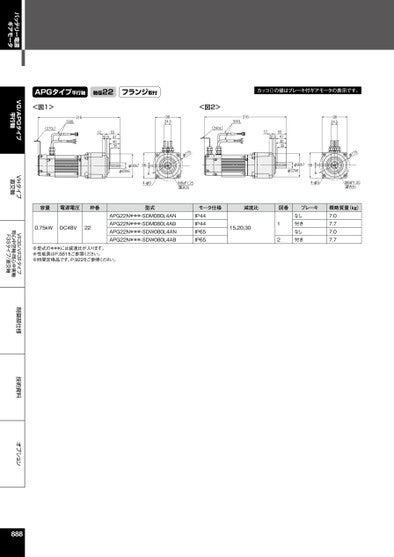 VG/APGタイプ平行軸VHタイプ直交軸VF3S/VF3Fタイプ同心中空軸・同心中実軸F3Sタイプ/直交軸制御部仕様技術資料オプションバッテリー電源ギアモータAPGタイプ平行軸軸径22フランジ取付カッコ()の値はブレーキ付ギアモータの表示です。<図1>316500L(275L)1259554140359824.5<図2>316500L(245L)φ90h7φ22h69864-φ9511φM8xP1.25深さ20125955414035φ90h7φ22h69864-φ9容量電源電圧枠番型式モータ仕様減速比図番ブレーキ0.75kWDC48V22APG22N***-SDM080L4ANAPG22N***-SDM080L4ABAPG22N***-SDW080L4ANAPG22N***-SDW080L4ABIP44IP44IP65IP6515,20,30なし付きなし付き12※型式の***には減速比が入ります。※性能表はP.881をご参照ください。※時間定格品です。P.922をご参照ください。9824.5511φM8xP1.25深さ20概略質量(kg)7.07.77.07.7888