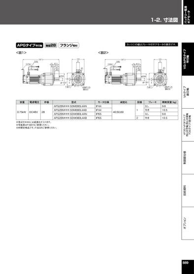 オプション技術資料制御部仕様VF3S/VF3Fタイプ同心中空軸・同心中実軸F3Sタイプ/直交軸VHタイプ直交軸VG/APGタイプ平行軸1-2.寸法図バッテリー電源ギアモータAPGタイプ平行軸軸径28フランジ取付カッコ()の値はブレーキ付ギアモータの表示です。<図1>347.5500L(275L)15563.51147.54540<図2>347.5500L(245L)12031041φφ28h6120φ110h784-φ11M8xP1.25深さ2063.51147.51554540φ28h6120φ110h784-φ11容量電源電圧枠番型式モータ仕様減速比図番ブレーキ0.75kWDC48V28APG28N***-SDM080L4ANAPG28N***-SDM080L4ABAPG28N***-SDW080L4ANAPG28N***-SDW080L4ABIP44IP44IP65IP6540,50,60なし付きなし付き12※型式の***には減速比が入ります。※性能表はP.881をご参照ください。※時間定格品です。P.922をご参照ください。12031041φM8xP1.25深さ20概略質量(kg)9.810.59.810.5889