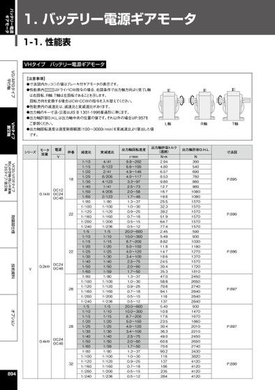 VG/APGタイプ平行軸VHタイプ直交軸VF3S/VF3Fタイプ同心中空軸・同心中実軸F3Sタイプ/直交軸制御部仕様技術資料オプションバッテリー電源ギアモータ1.バッテリー電源ギアモータ1-1.性能表VHタイプバッテリー電源ギアモータ【注意事項】●寸法図内カッコ()の値はブレーキ付ギアモータの表示です。●性能表内はドライバCW指令の場合、右図条件で出力軸方向より見てL軸は右回転、R軸、T軸は左回転であることを示します。回転方向を変換する場合はCW・CCWの指令を入れ替えてください。●性能表内の減速比は、減速比と実減速比があります。●出力軸のキー寸法・公差はJISB1301-1996普通形に準じます。●出力軸許容O.H.L.は出力軸中央の位置の値です。それ以外の場合はP.957をご参照ください。●出力軸回転速度は速度制御範囲(100~3000r/min)を実減速比より算出した値です。L軸R軸T軸シリーズモータ容量電源V枠番減速比実減速比1/101/151/201/251/301/401/501/601/801/1001/1201/1601/2001/2401/51/101/151/201/251/301/401/501/601/801/1001/1201/1601/2001/2401/51/101/151/201/251/301/401/501/601/801/1001/1201/1601/2001/2401822222828324/418/1232/418/2054/1231/414/2052/1231/801/1001/1201/1601/2001/2361/51/101/151/201/251/301/401/501/591/801/1001/1201/1601/2001/2361/51/101/151/201/251/301/401/501/591/801/1001/1201/1601/2001/2360.1kWDC12DC24DC480.2kWDC24DC48V0.4kWDC24DC48894出力軸回転速度出力軸許容トルク(連続)出力軸許容O.H.L.r/min9.8~2926.6~1954.9~1464.0~1173.3~972.5~732.0~581.7~481.3~371.0~300.9~250.7~180.5~150.5~1220.0~60010.0~3006.7~2005.0~1504.0~1203.4~1002.5~752.0~601.7~501.3~371.0~300.9~250.7~180.5~150.5~1220.0~60010.0~3006.7~2005.0~1504.0~1203.4~1002.5~752.0~601.7~501.3~371.0~300.9~250.7~180.5~150.5~12N・m2.944.806.578.539.8012.716.719.625.532.339.251.964.777.42.455.498.8211.814.718.624.530.435.347.058.870.694.11181375.4010.817.623.530.436.349.060.870.690.2118137186235284N39054069078088098010801080157015701570157015701570590930103011801270137015701720181024502650274028402840284093014701670186020102210245026502740343038204120412041204120寸法図P.895P.896P.896P.897P.897P.898