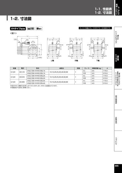 オプション技術資料制御部仕様VF3S/VF3Fタイプ同心中空軸・同心中実軸F3Sタイプ/直交軸VHタイプ直交軸VG/APGタイプ平行軸1-1.性能表1-2.寸法図バッテリー電源ギアモータ1-2.寸法図VHタイプ直交軸軸径18脚取付<図1>(300L)(A)A500L20.525.7611375761014-φ8.5カッコ()の値はブレーキ付ギアモータの表示です。302791325874φ9096116L軸13274583027148743027743027φ18h6φ18h6φ18h6φ18h62626926φ9096116R軸926φ9096116T軸容量電圧型式減速比図番ブレーキ0.1kWDC12V0.1kWDC24V0.1kWDC48VVHLC18#-***N100L1AVHLD18#-***N100L1AVHLC18#-***N100L2AVHLD18#-***N100L2AVHLC18#-***N100L4AVHLD18#-***N100L4A10,15,20,25,30,40,50,6010,15,20,25,30,40,50,6010,15,20,25,30,40,50,60111なし付きなし付きなし付き概略質量(kg)3.54.03.54.03.54.0A174.5215.5174.5215.5174.5215.5※型式の#には軸区分記号(L,R,T)が入ります。また、***には減速比が入ります。※性能表はP.894をご参照ください。895