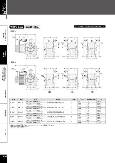 VG/APGタイプ平行軸VHタイプ直交軸VF3S/VF3Fタイプ同心中空軸・同心中実軸F3Sタイプ/直交軸制御部仕様技術資料オプションバッテリー電源ギアモータVHタイプ直交軸軸径22脚取付カッコ()の値はブレーキ付ギアモータの表示です。<図1>(300L)(A)A500L24.5148589040354035φ22h6φ22h61489058904035φ22h630.56150105701064-φ11φ1415.90116<図2>(300L)(A)A500L24.530.56150105701064-φ111489058φ1415.90116L軸12403512φ14.15901161245454514890584035φ22h6φ22h6904035φ22h64545φ14.1590116R軸1245904035φ22h61245904035φ22h61245180φ14.1590116180φ14.1590116T軸容量電圧型式減速比図番ブレーキ0.1kWDC12V0.1kWDC24V0.1kWDC48V0.2kWDC24V0.2kWDC48VVHLC22#-***N100L1AVHLD22#-***N100L1AVHLC22#-***N100L2AVHLD22#-***N100L2AVHLC22#-***N100L4AVHLD22#-***N100L4AVHLC22#-***N200L2AVHLD22#-***N200L2AVHLC22#-***N200L4AVHLD22#-***N200L4A80,100,120,160,200,24080,100,120,160,200,24080,100,120,160,200,2405,10,15,20,25,30,40,50,605,10,15,20,25,30,40,50,6011122※型式の#には軸区分記号(L,R,T)が入ります。また、***には減速比が入ります。※性能表はP.894をご参照ください。なし付きなし付きなし付きなし付きなし付き概略質量(kg)4.55.04.55.04.55.05.05.55.05.5A182.5223.5182.5223.5182.5223.5188229.5188229.5896