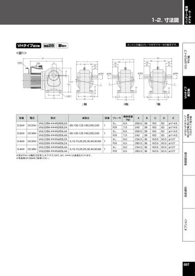 オプション技術資料制御部仕様VF3S/VF3Fタイプ同心中空軸・同心中実軸F3Sタイプ/直交軸VHタイプ直交軸VG/APGタイプ平行軸1-2.寸法図バッテリー電源ギアモータVHタイプ直交軸軸径28脚取付カッコ()の値はブレーキ付ギアモータの表示です。<図1>(300L)(A)500LAB31801258174.51204-φ1145401550CD100100126L軸CD1004540φ28h6φ28h6φ28h6EE1550100126R軸454050200100100100126T軸φ28h6E45401550容量電圧型式減速比図番ブレーキ概略質量(kg)ABCDE0.2kWDC24V0.2kWDC48V0.4kWDC24V0.4kWDC48VVHLC28#-***N200L2AVHLD28#-***N200L2AVHLC28#-***N200L4AVHLD28#-***N200L4AVHLC28#-***N400L2AVHLD28#-***N400L2AVHLC28#-***N400L4AVHLD28#-***N400L4A80,100,120,160,200,24080,100,120,160,200,2405,10,15,20,25,30,40,50,605,10,15,20,25,30,40,50,601111※型式の#には軸区分記号(L,R,T)が入ります。また、***には減速比が入ります。※性能表はP.894をご参照ください。なし付きなし付きなし付きなし付き6.57.56.57.58.08.58.08.5200.5242200.5242234.5280.5234.5280.53939393936363636163163163163163.5163.5163.5163.56363636363.563.563.563.5φ114.5φ114.5φ114.5φ114.5φ127φ127φ127φ127897