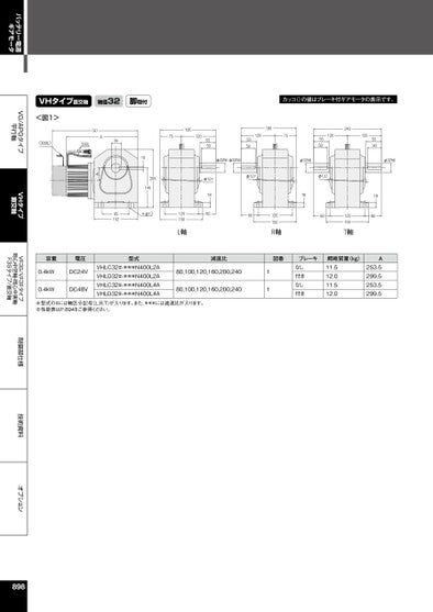 VG/APGタイプ平行軸VHタイプ直交軸VF3S/VF3Fタイプ同心中空軸・同心中実軸F3Sタイプ/直交軸制御部仕様技術資料オプションバッテリー電源ギアモータVHタイプ直交軸軸径32脚取付カッコ()の値はブレーキ付ギアモータの表示です。<図1>(300L)19575120(A)A500L354510205140951524-φ13120150L軸5550φ127186019512075555024012055501205550φ32h6φ32h6φ32h6φ32h6φ12760120150R軸18φ127601860120150T軸容量電圧型式減速比図番ブレーキ0.4kWDC24V0.4kWDC48VVHLC32#-***N400L2AVHLD32#-***N400L2AVHLC32#-***N400L4AVHLD32#-***N400L4A80,100,120,160,200,24080,100,120,160,200,24011なし付きなし付き概略質量(kg)11.512.011.512.0A253.5299.5253.5299.5※型式の#には軸区分記号(L,R,T)が入ります。また、***には減速比が入ります。※性能表はP.894をご参照ください。898