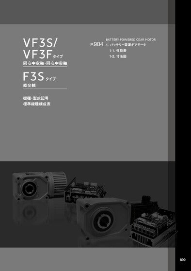 VF3S/VF3FタイプF3Sタイプ同心中空軸・同心中実軸直交軸機種・型式記号標準機種構成表P.904BATTERYPOWEREDGEARMOTOR1.バッテリー電源ギアモータ1-1.性能表1-2.寸法図899