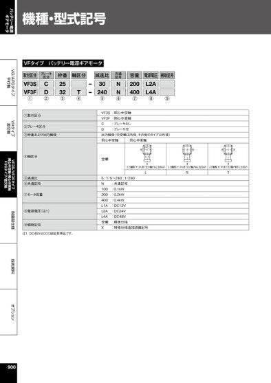 VG/APGタイプ平行軸VHタイプ直交軸VF3S/VF3Fタイプ同心中空軸・同心中実軸F3Sタイプ/直交軸制御部仕様技術資料オプションバッテリー電源ギアモータ①取付区分②ブレーキ区分③枠番および出力軸径④軸区分⑤減速比⑥共通記号⑦モータ容量⑧電源電圧(注1)⑨補助記号注1.DC48VはCCC認証取得品です。VF3S:同心中空軸VF3F:同心中実軸:ブレーキなしCD:ブレーキ付出力軸径(中空軸は内径、その他のタイプは外径)同心中空軸同心中実軸空欄ギアヘッドモータ入力軸側()から見て出力軸が左に出るもの入力軸側()から見て出力軸が右に出るもの入力軸側()から見て出力軸が両方に出るものLRT5:1/5~240:1/240N100200400L1AL2AL4A空欄X:共通記号:0.1kW:0.2kW:0.4kW:DC12V:DC24V:DC48V:標準仕様:特殊仕様追加認識記号共通記号NN⑥容量200400⑦電源電圧補助記号L2AL4A⑧⑨ブレーキ区分枠番軸区分減速比30240⑤T④2532③CD②取付区分VF3SVF3F①VFタイプバッテリー電源ギアモータ機種・型式記号900