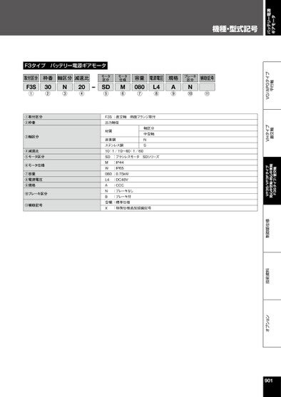 オプション技術資料制御部仕様VF3S/VF3Fタイプ同心中空軸・同心中実軸F3Sタイプ/直交軸VHタイプ直交軸VG/APGタイプ平行軸機種・型式記号バッテリー電源ギアモータF3タイプバッテリー電源ギアモータ取付区分枠番軸区分減速比F3S①30②N③20④モータ区分SD⑤モータ仕様M⑥容量080⑦電源電圧規格ブレーキ区分補助記号L4⑧A⑨N⑩⑪①取付区分②枠番③軸区分④減速比⑤モータ区分⑥モータ仕様⑦容量⑧電源電圧⑨規格⑩ブレーキ区分⑪補助記号F3S:直交軸両面フランジ取付出力軸径材質軸区分中空軸NS:IP44:IP65炭素鋼ステンレス鋼10:1/10~60:1/60SD:ブラシレスモータSDシリーズMW080:0.75kW:DC48VL4:CCCA:ブレーキなしNB:ブレーキ付空欄:標準仕様X:特殊仕様追加認識記号901