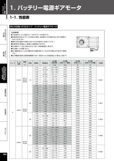 VG/APGタイプ平行軸VHタイプ直交軸VF3S/VF3Fタイプ同心中空軸・同心中実軸F3Sタイプ/直交軸制御部仕様技術資料オプションバッテリー電源ギアモータ1.バッテリー電源ギアモータ1-1.性能表同心中空軸/VF3Sタイプバッテリー電源ギアモータ【注意事項】●寸法図内カッコ()の値はブレーキ付ギアモータの表示です。●性能表内はドライバCW指令の場合、右図条件で出力軸方向より見て右回転であることを示します。●回転方向を変換する場合はCW・CCWの指令を入れ替えてください。●性能表内の減速比は、減速比と実減速比があります。●出力軸のキー寸法・公差はJISB1301-1996普通形に準じます。●出力軸キーは付属しません。●出力軸許容O.H.L.は出力軸中央の位置の値です。それ以外の場合はP.957をご参照ください。●出力軸回転速度は速度制御範囲(100~3000r/min)を実減速比より算出した値です。シリーズモータ容量電源V枠番減速比実減速比0.1kWDC12DC24DC4815253030350.2kWDC24DC48V0.4kWDC24DC489041/101/151/201/251/301/401/501/601/801/1001/1201/1601/101/151/201/251/301/401/501/601/801/1001/1201/1601/2001/2401/101/151/201/251/301/401/501/601/801/1001/1201/1601/2001/2404/418/1232/418/2054/1231/414/2052/1231/822/2051/1231/1641/101/151/2019/4701/301/401/501/601/8019/18801/1201/1601/2001/2401/101/151/2019/4701/301/401/501/601/8019/18801/1201/1601/2001/240出力軸回転速度r/min9.8~2926.6~1954.9~1464.0~1173.3~972.5~732.0~581.7~481.3~361.0~290.9~240.7~1810.0~3006.7~2005.0~1504.1~1213.4~1002.5~752.0~601.7~501.3~371.1~300.9~250.7~180.5~150.5~1210.0~3006.7~2005.0~1504.1~1213.4~1002.5~752.0~601.7~501.3~371.1~300.9~250.7~180.5~150.5~12出力軸許容トルク(連続)出力軸許容O.H.L.出力軸許容スラスト荷重寸法図N・m2.454.516.378.339.8012.716.719.625.532.339.251.94.908.3311.814.718.624.530.435.347.058.870.694.11181379.4015.620.527.433.344.153.964.688.2108127176225270N34044054064074083093093010301030103010301520172018602010211023002450255030903140314031403140314019102160240025502650284029903090348035303530363036303630N108147186226245275294294324324343343380429466502527576613637775785785785785785475539600637662711747767873883883912912912P.907P.907P.908P.908P.909