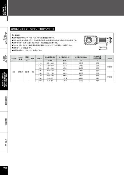 VG/APGタイプ平行軸VHタイプ直交軸VF3S/VF3Fタイプ同心中空軸・同心中実軸F3Sタイプ/直交軸制御部仕様技術資料オプションバッテリー電源ギアモータ直交軸/F3タイプバッテリー電源ギアモータ【注意事項】●出力軸許容O.H.L.は、P.957のO.H.Lの荷重位置の値です。●出力軸の回転方向は、ドライバCW指令の場合、右図条件で出力軸方向より見て右回転です。●出力軸のキー寸法・公差はJISB1301-1996普通形に準じます。●加速時、減速時に出力軸側慣性負荷が振動しないようにゲインを調整しご使用ください。●出力軸キーは付属しません。●時間定格品です。P.922をご参照ください。シリーズモータ容量電源V枠番減速比SD0.75kWDC48301/101/151/201/251/301/401/501/60出力軸回転速度出力軸許容トルク出力軸許容O.H.L.出力軸許容スラスト荷重r/min8.0~4005.5~2704.0~2003.2~1602.7~1302.0~1001.6~801.3~67N・m21.532.243.053.764.585.9107.4128.9N19102160240025502650284029903090N475539600637662711747767寸法図P.914P.914906