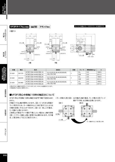 VG/APGタイプ平行軸VHタイプ直交軸VF3S/VF3Fタイプ同心中空軸・同心中実軸F3Sタイプ/直交軸制御部仕様技術資料オプションバッテリー電源ギアモータVF3Fタイプ同心中実軸軸径18フランジ取付カッコ()の値はブレーキ付ギアモータの表示です。<図1>127964848313027158964848313027313027フランジ面4-φ8.64-φ10.54-M10×P1.5フランジ面φ18h6フランジ面φ18h64-φ10.54-M10×P1.54-M10×P1.5フランジ面φ18h64-φ8.4以上4-M10×P1.549396983949(A)A44.535.511469.560.520.5フランジ面500ℓ(300ℓ)13253838L軸13253838T軸容量電圧型式減速比図番ブレーキ0.1kWDC12V0.1kWDC24V0.1kWDC48VVF3FC18#-***N100L1AVF3FD18#-***N100L1AVF3FC18#-***N100L2AVF3FD18#-***N100L2AVF3FC18#-***N100L4AVF3FD18#-***N100L4A10,15,20,25,30,40,50,60,80,100,120,16010,15,20,25,30,40,50,60,80,100,120,16010,15,20,25,30,40,50,60,80,100,120,160111なし付きなし付きなし付き概略質量(kg)3.54.03.54.03.54.0A190.5231.5190.5231.5190.5231.5※型式の#には軸区分記号(L,T)が入ります。また、***には減速比が入ります。※性能表はP.905をご参照ください。■VF3F(同心中実軸)18枠の軸区分についてVF3F同心中実軸)18枠は軸区分記号"R軸"の設定はありません。片軸タイプはL軸が標準になります。〔図-1〕VF3Fは両面フランジ取付のため、モータ軸を中心に180°回すことにより出力軸を右側にすることができます。〔図-2〕但しこの場合、リード線が上側になります。ご使用上の都合でリード線を下側にしたい場合は、L軸の状態〔図-1〕でリード線を上側に変更する必要があります。その場合、ご発注時に「TZ」とご指示ください。<モータ側から見た図>出力軸がL軸の場合、モータ側から見てリード線が下の時、出力軸は左側になります。〔図-1〕〔図-2〕出力軸リード線モータ軸を中心に180°回した時910