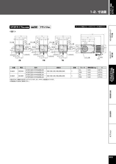 オプション技術資料制御部仕様VF3S/VF3Fタイプ同心中空軸・同心中実軸F3Sタイプ/直交軸VHタイプ直交軸VG/APGタイプ平行軸1-2.寸法図バッテリー電源ギアモータVF3Fタイプ同心中実軸軸径32フランジ取付カッコ()の値はブレーキ付ギアモータの表示です。<図1>19412462627フランジ面φ85h74-φ16.54-φ13.74-M16×P218405858L軸6375550フランジ面フランジ面637555019412462627637フランジ面5550フランジ面φ32h6φ32h6φ85h7φ85h74-M16×P24-φ16.54-M16×P2184-φ13.7405858R軸φ32h6φ85h7φ85h74-φ16.54-M16×P2184-M16×P26375550フランジ面φ32h6φ85h7685410(A)A685422215414035φ12813654684-M16×P2フランジ面(300ℓ)500ℓ25012462624-φ13.74058T軸58容量電圧型式減速比図番ブレーキ0.4kWDC24V0.4kWDC48VVF3FC32#-***N400L2AVF3FD32#-***N400L2AVF3FC32#-***N400L4AVF3FD32#-***N400L4A80,100,120,160,200,24080,100,120,160,200,24011なし付きなし付き概略質量(kg)13.514.013.514.0A327.5373.5327.5373.5※型式の#には軸区分記号(L,R,T)が入ります。また、***には減速比が入ります。※性能表はP.905をご参照ください。913