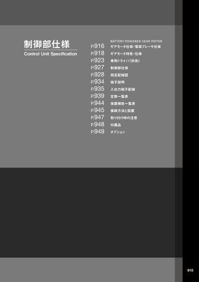 制御部仕様ControlUnitSpecificationP.916P.918P.923P.927P.928P.934P.935P.939P.944P.945P.947P.948P.949BATTERYPOWEREDGEARMOTORギアモータ仕様・電磁ブレーキ仕様ギアモータ特性・仕様専用ドライバ(別売)制御部仕様相互配線図端子説明入出力端子配線定数一覧表保護機能一覧表接続方法と設置取り付け時の注意付属品オプション915