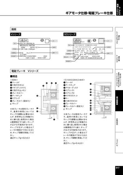 オプション技術資料制御部仕様VF3S/VF3Fタイプ同心中空軸・同心中実軸F3Sタイプ/直交軸VHタイプ直交軸VG/APGタイプ平行軸バッテリー電源ギアモータギアモータ仕様・電磁ブレーキ仕様銘板Vシリーズ型式定格値保護構造製造番号10VGLC18-10N200L2ABRUSHLESSMOTOR200W24V9.8A2500rpmRATIO10:1Ins.EIP30S1CONT.MFG.No.12345678001madeinJapan2022NISSEICORP.QRコード減速比耐熱クラスSDシリーズBRUSHLESSDIRECTCURRENTMOTOR无刷直流电动机100L4AN0-SDM0Y3Y4Y5RAT8Y610.52:A5QRコード減速比耐熱クラス88mi.n/6%10P1型式定格値保護構造製品QRコード製造番号Y75F3S30N1Y01Y2.Wk0AC3PHIP44⎓48V.sBInMFG.NO.IO19S312级3000rTE1234567890%EDmadeinJapan制造地:日本NISSEICORP.制造商名称:株式会社日精g91718574623910<0.1kW,0.2kW,0.4kW>❶フィールド❷アーマチュア❸アウターディスク❹スプリング1❺スプリング2❻キクザガネナット❼キー❽六角穴付ボルト❾ブレーキカバーブレーキカバー固定ネジg:ギャップ※本ブレーキは保持ブレーキです。通常の使用においてはギャップの調整は必要ありませんが、非常停止など制動のために繰り返し使用された場合は摩擦板がすり減り、ギャップが広がる可能性があります。ギャップが広がった場合はブレーキの開放ができなくなるため、ギャップ調整を実施してください。適正ギャップg=0.4±0.13214g7電磁ブレーキVシリーズ568■構造<50W>❶フィールド❷六角穴付ボルト❸マサツディスククミ❹六角穴付止メネジ❺ブレーキカバー❻アーマチュア❼スプリング❽ブレーキカバー固定ネジg:ギャップ※本ブレーキは保持ブレーキです。通常の使用においてはギャップの調整は必要ありませんが、非常停止など制動のために繰り返し使用された場合は摩擦板がすり減り、ギャップが広がる可能性があります。ギャップが広がった場合はブレーキの開放ができなくなるため、ギャップ調整を実施してください。適正ギャップg=0.2±0.1