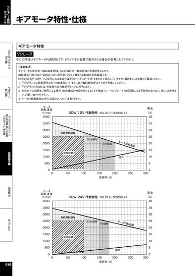 VG/APGタイプ平行軸VHタイプ直交軸VF3S/VF3Fタイプ同心中空軸・同心中実軸F3Sタイプ/直交軸制御部仕様技術資料オプションバッテリー電源ギアモータギアモータ特性・仕様ギアモータ特性Vシリーズ※この特性はギアモータ代表特性です。ドライバをお客様で製作される場合の参考にしてください。【注意事項】ギアモータの負荷率-回転速度特性、および負荷率-電流特性の代表例を示します。回転速度100r/min~2500r/min、負荷率100%で囲まれる範囲が定格範囲です。時間定格(5分・30分)でご使用になる場合の目安(コールドスタート時)をあわせて表示していますが、最終的には実機でご確認ください。1.下のグラフでは回転速度はモータ軸換算しています。出力軸回転速度はギア比を考慮してください。2.下のグラフの100%は、性能表の出力軸許容トルクに相当します。3.定格外での範囲をご使用になる場合、減速機部の寿命が短くなることや電磁ブレーキのブレーキ力が問題になる可能性があります。詳しくは当社まで、お問い合わせください。4.モータの表面温度は90℃を超えないようご注意ください。モータ回転速度(r/min)400035003000250020001500100050000モータ回転速度(r/min)40003500300025002000150010005000050W12V代表特性VGLD12-30N50L1A電流(A)連続運転領域定格範囲30分領域5分領域モータ回転速度電流50100150200250300負荷率(%)403530252015105050W24V代表特性VGLD12-30N50L2A電流(A)連続運転領域定格範囲30分領域5分領域モータ回転速度電流50100150200250300負荷率(%)4035302520151050918