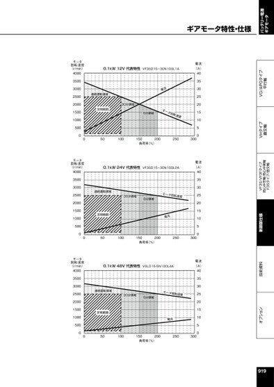オプション技術資料制御部仕様VF3S/VF3Fタイプ同心中空軸・同心中実軸F3Sタイプ/直交軸VHタイプ直交軸VG/APGタイプ平行軸バッテリー電源ギアモータモータ回転速度(r/min)400035003000250020001500100050000モータ回転速度(r/min)400035003000250020001500100050000モータ回転速度(r/min)400035003000250020001500100050000ギアモータ特性・仕様0.1kW12V代表特性VF3SD15-30N100L1A電流(A)連続運転領域定格範囲30分領域流電5分領域モータ回転速度50100150200250300負荷率(%)40353025201510500.1kW24V代表特性VF3SD15-30N100L2A連続運転領域定格範囲30分領域5分領域モータ回転速度流電50100150200250300負荷率(%)電流(A)40353025201510500.1kW48V代表特性VGLD15-5N100L4A電流(A)連続運転領域定格範囲30分領域5分領域モータ回転速度電流50100150200250300負荷率(%)4035302520151050919