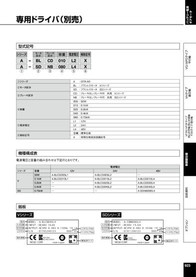 オプション技術資料制御部仕様VF3S/VF3Fタイプ同心中空軸・同心中実軸F3Sタイプ/直交軸VHタイプ直交軸VG/APGタイプ平行軸バッテリー電源ギアモータSDシリーズ型式入力仕様出力仕様シリアル海外規格MODELINPUTOUTS/N::PUT::A-S4CDC3A190DNB8VPH112010980L9-04A6.48V1320-333Hz00019.75A40ソフトウェアVerハードウェアVerR-R-NCj-ASDNB080L4NISSEICORP.10madeinjapan製品QRコード9230-150Hz10.00011A10ソフトウェアVerハードウェアVerLCD8VPH05240L4010.6A0448V132-0::T::A-DA0B4CC317PMODELINPUTOUUS/TNMSIP-REM-NCj-ABLCD040L410NISSEICORP.madeinjapan製品QRコード型式入力仕様出力仕様シリアル海外規格容量50W0.1kW0.2kW0.4kW0.75kW12VA-BLCD005L1A-BLCD010L1―――電源電圧24VA-BLCD005L2A-BLCD010L2A-BLCD020L2A-BLCD040L2―48V―A-BLCD010L4A-BLCD020L4A-BLCD040L4A-SDNB080L4シリーズVSD銘板Vシリーズ:GTR-AR:ブラシレスモータVシリーズABLSD:ブラシレスモータSDシリーズCD:ブレーキなし・ブレーキ付共用VシリーズNB:ブレーキなし・ブレーキ付共用SDシリーズ005:50W010:0.1kW020:0.2kW040:0.4kW080:0.75kWL1L2L4空欄:標準仕様X:特殊仕様追加認識記号:12V:24V:48V電源電圧補助記号XX⑥L2L4⑤モータ区分BLSD②ブレーキ区分CDNB③容量010080④型式記号シリーズAA①①シリーズ②モータ区分③ブレーキ区分④容量⑤電源電圧⑥補助記号機種構成表電源電圧と容量の組み合わせは下記のとおりです。専用ドライバ(別売)