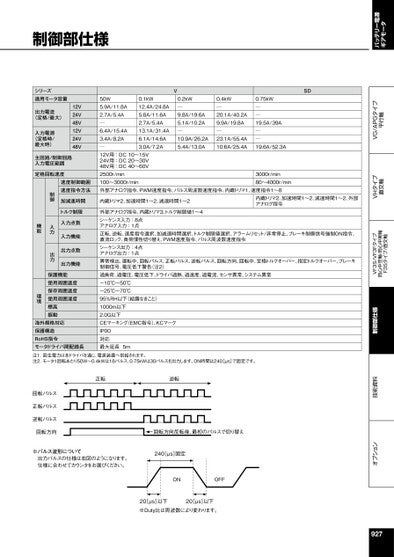 オプション技術資料制御部仕様VF3S/VF3Fタイプ同心中空軸・同心中実軸F3Sタイプ/直交軸VHタイプ直交軸VG/APGタイプ平行軸バッテリー電源ギアモータ加減速時間内蔵トリマ2、加速時間1~2、減速時間1~2内蔵トリマ2、加速時間1~2、減速時間1~2、外部アナログ指令外部アナログ指令、内蔵トリマ3、トルク制限値1~4シーケンス入力:8点アナログ入力:1点正転、逆転、速度指令選択、加減速時間選択、トルク制限値選択、アラームリセット/非常停止、ブレーキ制御信号強制ON指令、直流ロック、負荷慣性切り替え、PWM速度指令、パルス周波数速度指令シーケンス出力:4点アナログ出力:1点異常検出、運転中、回転パルス、正転パルス、逆転パルス、回転方向、回転中、定格トルクオーバー、指定トルクオーバー、ブレーキ制御信号、電圧低下警告(注2)過負荷、過電圧、電圧低下、ドライバ過熱、過速度、過電流、センサ異常、システム異常-10℃~50℃-25℃~70℃95%RH以下(結露なきこと)1000m以下2.0G以下CEマーキング(EMC指令)、KCマークIP00対応最大延長5mトルク制限入力点数入力機能出力点数出力機能制御出力入力機能保護機能使用周囲温度保存周囲温度使用周囲湿度標高振動環境海外規格対応保護構造RoHS指令モータドライバ間配線長シリーズ適用モータ容量出力電流(定格/最大)入力電源(定格時/最大時)12V24V48V12V24V48V主回路/制御回路入力電圧範囲定格回転速度速度制御範囲速度指令方法VSD0.1kW12.4A/24.8A5.8A/11.6A2.7A/5.4A13.1A/31.4A6.1A/14.6A3.0A/7.2A0.2kW─9.8A/19.6A5.1A/10.2A─10.9A/26.2A5.4A/13.0A0.4kW─20.1A/40.2A9.9A/19.8A─23.1A/55.4A10.6A/25.4A50W5.9A/11.8A2.7A/5.4A─6.4A/15.4A3.4A/8.2A─12V用:DC10~15V24V用:DC20~30V48V用:DC40~60V2500r/min100~3000r/min外部アナログ指令、PWM速度指令、パルス周波数速度指令、内蔵トリマ1、速度指令1~80.75kW──19.5A/39A──19.6A/52.3A3000r/min80~4000r/min注1.回生電力は本ドライバを通じ、電源装置へ供給されます。注2.モータ1回転あたり50W~0.4kWは18パルス、0.75kWは30パルスを出力します。ON時間は240[μs]で固定です。正転逆転回転パルス正転パルス逆転パルス回転方向回転方向反転後、最初のパルスで切り替え※パルス波形について出力パルスの仕様は右図のようになります。仕様に合わせてカウンタをお選びください。240[μs]固定ONOFF20μs]以下※Duty比は周波数により変わります。20[μs]以下927制御部仕様