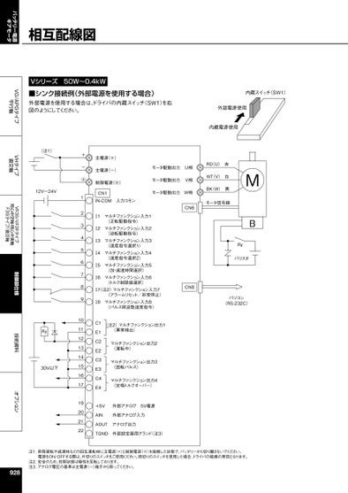 VG/APGタイプ平行軸VHタイプ直交軸VF3S/VF3Fタイプ同心中空軸・同心中実軸F3Sタイプ/直交軸制御部仕様技術資料オプションバッテリー電源ギアモータ相互配線図Vシリーズ50W~0.4kW■シンク接続例(外部電源を使用する場合)外部電源を使用する場合は、ドライバの内蔵スイッチ(SW1)を右図のようにしてください。内蔵スイッチ(SW1)外部電源使用内蔵電源使用主電源(+)主電源(-)制御電源()+○CN1IN-COM入力コモンモータ駆動出力U相モータ駆動出力V相モータ駆動出力W相CN6RD(U)赤WTV)白BK(W)黒モータ信号線MBRyバリスタCN8パソコン(RS-232C)(注1)12V~24VRy30V以下+-+○123456789101112131415161719202122Ⅰ1マルチファンクション入力1(正転駆動指令)Ⅰ2マルチファンクション入力2(逆転駆動指令)Ⅰ3マルチファンクション入力3(速度指令選択1)Ⅰ4マルチファンクション入力4(速度指令選択2)Ⅰ5マルチファンクション入力5(加・減速時間選択)Ⅰ6マルチファンクション入力6(トルク制限値選択)Ⅰ7(注2)マルチファンクション入力7(アラームリセット/非常停止)Ⅰ8マルチファンクション入力8(パルス周波数速度指令)C1E1C2E2C3E3C4E4(注2)マルチファンクション出力1(異常検出)マルチファンクション出力2(運転中)マルチファンクション出力3(回転パルス)マルチファンクション出力4(定格トルクオーバー)+5V外部アナログ5V電源AIN外部アナログ入力AOUTアナログ出力TGND外部設定器用グランド(注3)電源をON/OFFする際は、片切りのスイッチをご使用ください。両切りのスイッチを使用した場合、ドライバの破損の原因となります。注1.昇降運転や減速時などの回生運転時に主電源(+)と制御電源(⊕)を接続した状態で、バッテリーから切り離さないでください。注2.安全のため、初期状態は極性を反転しております。注3.アナログ電圧の基準は主電源(-)端子から取ってください。928