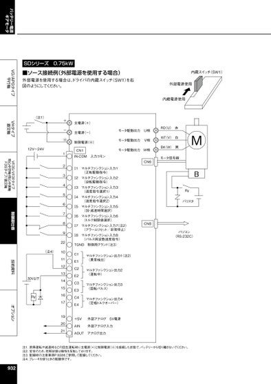 VG/APGタイプ平行軸VHタイプ直交軸VF3S/VF3Fタイプ同心中空軸・同心中実軸F3Sタイプ/直交軸制御部仕様技術資料オプションバッテリー電源ギアモータSDシリーズ0.75kW■ソース接続例(外部電源を使用する場合)外部電源を使用する場合は、ドライバの内蔵スイッチ(SW1)を右図のようにしてください。内蔵スイッチ(SW1)外部電源使用内蔵電源使用主電源(+)主電源(-)制御電源()+○CN1IN-COM入力コモンモータ駆動出力U相モータ駆動出力V相モータ駆動出力W相CN6RD(U)赤WTV)白BK(W)黒モータ信号線MBRyバリスタCN8パソコン(RS-232C)(注1)12V~24V(注4)30V以下Ry+-+○123456789221011121314151617192021Ⅰ1マルチファンクション入力1(正転駆動指令)Ⅰ2マルチファンクション入力2(逆転駆動指令)Ⅰ3マルチファンクション入力3(速度指令選択1)Ⅰ4マルチファンクション入力4(速度指令選択2)Ⅰ5マルチファンクション入力5(加・減速時間選択)Ⅰ6マルチファンクション入力6(トルク制限値選択)Ⅰ7マルチファンクション入力7(注2)(アラームリセット/非常停止)Ⅰ8マルチファンクション入力8(パルス周波数速度指令)TGND制御用グランド(注3)C1E1C2E2C3E3C4E4マルチファンクション出力1注2)(異常検出)マルチファンクション出力2(運転中)マルチファンクション出力3(回転パルス)マルチファンクション出力4(定格トルクオーバー)+5V外部アナログ5V電源AIN外部アナログ入力AOUTアナログ出力注1.昇降運転や減速時などの回生運転時に主電源(+)と制御電源(⊕)を接続した状態で、バッテリーから切り離さないでください。注2.安全のため、初期状態は極性を反転しております。注3.配線時の注意事項P.938をご参照して配線してください。注4.ブレーキを使うときの配線例です。932