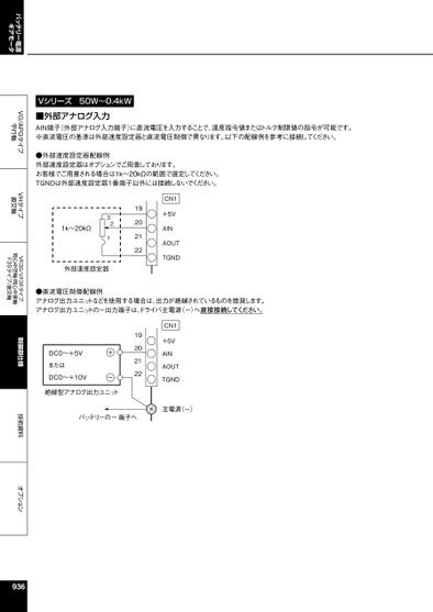 VG/APGタイプ平行軸VHタイプ直交軸VF3S/VF3Fタイプ同心中空軸・同心中実軸F3Sタイプ/直交軸制御部仕様技術資料オプションバッテリー電源ギアモータVシリーズ50W~0.4kW■外部アナログ入力AIN端子(外部アナログ入力端子)に直流電圧を入力することで、速度指令値またはトルク制限値の指令が可能です。※直流電圧の基準は外部速度設定器と直流電圧制御で異なります。以下の配線例を参考に接続してください。●外部速度設定器配線例外部速度設定器はオプションでご用意しております。お客様でご用意される場合は1k~20kΩの範囲で選定してください。TGNDは外部速度設定器1番端子以外には接続しないでください。19202122CN1+5VAINAOUTTGND1k~20kΩ231外部速度設定器●直流電圧制御配線例アナログ出力ユニットなどを使用する場合は、出力が絶縁されているものを推奨します。アナログ出力ユニットの-出力端子は、ドライバ主電源(-)へ直接接続してください。19202122CN1+5VAINAOUTTGNDDC0~+5VまたはDC0~+10V+-絶縁型アナログ出力ユニットバッテリーの-端子へ主電源(-)936