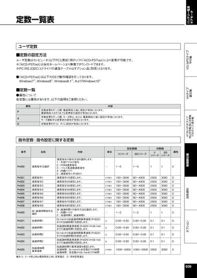 オプション技術資料制御部仕様VF3S/VF3Fタイプ同心中空軸・同心中実軸F3Sタイプ/直交軸VHタイプ直交軸VG/APGタイプ平行軸バッテリー電源ギアモータ定数一覧表ユーザ定数■定数の設定方法ユーザ定数はコンピュータ(以下PCと表記)用のソフト「ACD-PSTool」により変更が可能です。※「ACD-PSTool」は当社ホームページより無償でダウンロードできます。※PC(RS-232C)とドライバの通信ケーブルはオプション品(別売)となります。●「ACD-PSTool」は以下のOSで動作確認を行っております。Windows7®、Windows8®、Windows8.1®、およびWindows10®■定数一覧●属性について各定数には属性があります。以下の説明をご参照ください。属性PSD定数変更を行った際、電源再投入後に設定が有効になります。電源再投入を行うまでは変更前の設定が有効となります。定数変更を行った際、モータ停止、または、電源再投入後に設定が有効になります。モータ運転中は変更前の設定が有効となります。定数変更を行うと、すぐに設定が有効になります。内容指令定数:指令設定に関する定数番号名称内容単位設定範囲初期値VシリーズSDシリーズVシリーズSDシリーズ属性Pn000速度指令元選択Pn001Pn002Pn003Pn004Pn005Pn006Pn007Pn008Pn020速度指令1速度指令2速度指令3速度指令4速度指令5速度指令6速度指令7速度指令8加・減速時間指令元選択Pn021加速時間1Pn022減速時間1Pn023加速時間2Pn024減速時間2Pn025加減速時間基準速度速度指令の指令方法を選択します。1:外部アナログ指令2:PWM速度指令3:パルス周波数速度指令4:内蔵トリマ15:速度指令1(Pn001)速度指令1を設定します。速度指令2を設定します。速度指令3を設定します。速度指令4を設定します。速度指令5を設定します。速度指令6を設定します。速度指令7を設定します。速度指令8を設定します。加・減速時間1の指令方法を選択します。1:内蔵トリマ22:加速時間1,減速時間10r/minから加減速時間基準速度(Pn025)までの加速時間1を設定します。加減速時間基準速度(Pn025)から0r/minまでの減速時間1を設定します。0r/minから加減速時間基準速度(Pn025)までの加速時間2を設定します。加減速時間基準速度(Pn025)から0r/minまでの減速時間2を設定します。加減速時間の基準速度を設定します。加速時間:0r/minから本定数までの時間減速時間:本定数から0r/minまでの時間属性S:モータ停止時or電源再投入時に変更適応D:常時変更適応─1~51~511r/minr/minr/minr/minr/minr/minr/minr/min100~3000100~3000100~3000100~3000100~3000100~3000100~3000100~300080~400080~400080~400080~400080~400080~400080~400080~4000─1~21~2ssss0.00~5.000.00~5.000.00~5.000.00~5.000.00~5.000.00~5.000.00~5.000.00~5.002500250025002500250025002500250010.10.10.10.13000300030003000300030003000300010.10.10.10.1r/min1000~50001000~500025003000SDDDDDDDDSDDDDS939
