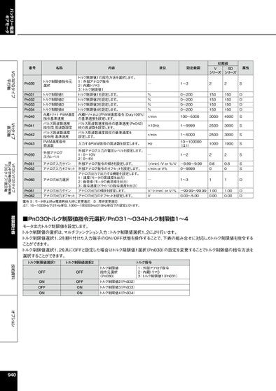 VG/APGタイプ平行軸VHタイプ直交軸VF3S/VF3Fタイプ同心中空軸・同心中実軸F3Sタイプ/直交軸制御部仕様技術資料オプションバッテリー電源ギアモータ番号名称内容単位設定範囲初期値VシリーズSDシリーズ属性Pn030Pn031Pn032Pn033Pn034Pn040Pn041Pn042Pn043Pn050Pn051Pn052トルク制限値指令元選択トルク制限値1トルク制限値2トルク制限値3トルク制限値4内蔵トリマ1・PWM速度指令基準速度パルス周波数速度指令用周波数設定パルス周波数速度指令用基準速度PWM速度指令周波数外部アナログ入力レベルアナログ入力ゲインアナログ入力オフセットPn060アナログ出力選択Pn061Pn062アナログ出力ゲインアナログ出力オフセットトルク制限値1の指令方法を選択します。1:外部アナログ指令2:内蔵トリマ33:トルク制限値1トルク制限値1を設定します。トルク制限値2を設定します。トルク制限値3を設定します。トルク制限値4を設定します。内蔵トリマおよびPWM速度指令(Duty100%)の基準速度を設定します。パルス周波数速度指令の基準速度(Pn042)時の周波数を設定します。パルス周波数速度指令の基準速度を設定します。─%%%%r/min×10Hzr/min入力するPWM信号の周波数を設定します。Hz1~30~2000~2000~2000~20022150150150150150150150150100~5000300040001~99991~500010~100000(注1)250030002500300010001000外部アナログ入力の電圧レベルを設定します。1:0~10V2:0~5V外部アナログ指令の傾きを設定します。外部アナログ指令のオフセットを設定します。アナログ出力で出力する機能を設定します。1:速度(モータの実速度を出力)2:負荷率(モータの負荷率を出力)3:指令速度(ドライバの指令速度を出力)アナログ出力の傾きを設定します。アナログ出力のオフセットを設定します。─1~2(r/min)/Vor%/Vr/minorV%-9.99~9.990~9999─1~320.60120.801V/r/min)orV/%V-99.99~99.990.00~5.001.000.001.000.00SDDDDSSSSSSSDDD属性S:モータ停止時or電源再投入時に変更適応D:常時変更適応注1.10~1000Hzでは1Hz単位、1000~100000Hzは10Hz単位での設定となります。■Pn030トルク制限値指令元選択/Pn031~034トルク制限値1~4モータ出力トルク制限値を設定します。トルク制限値の選択は、マルチファンクション入力:トルク制限値選択1、2により行います。トルク制限値選択1、2を割り付けた入力端子のON/OFF状態を操作することで、下表の組み合せに対応したトルク制限値を指令することができます。トルク制限値選択1、2を共にOFFと設定した場合はトルク制限値1選択(Pn030)の設定を変更することでトルク制限値の指令方法を選択することができます。トルク制限値選択1トルク制限値選択2トルク指令OFFONOFFONOFFOFFONONトルク制限値指令元選択(Pn030)トルク制限値2(Pn032)トルク制限値3(Pn033)トルク制限値4(Pn034)1:外部アナログ指令2:内蔵トリマ33:トルク制限値1(Pn031)940