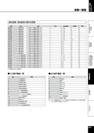 オプション技術資料制御部仕様VF3S/VF3Fタイプ同心中空軸・同心中実軸F3Sタイプ/直交軸VHタイプ直交軸VG/APGタイプ平行軸バッテリー電源ギアモータ定数一覧表指令定数:指令設定に関する定数番号名称内容単位設定範囲初期値属性Pn100Pn101Pn102Pn103Pn104Pn105Pn106Pn107Pn110Pn111Pn112Pn113Pn114Pn115Pn116Pn117Pn120Pn121Pn122Pn123Pn125Pn126Pn127Pn128Ⅰ1入力機能選択Ⅰ2入力機能選択Ⅰ3入力機能選択Ⅰ4入力機能選択Ⅰ5入力機能選択Ⅰ6入力機能選択Ⅰ7入力機能選択Ⅰ8入力機能選択Ⅰ1入力極性選択Ⅰ2入力極性選択Ⅰ3入力極性選択Ⅰ4入力極性選択Ⅰ5入力極性選択Ⅰ6入力極性選択Ⅰ7入力極性選択Ⅰ8入力極性選択C1-E1出力機能選択C2-E2出力機能選択C3-E3出力機能選択C4-E4出力機能選択C1-E1出力極性選択C2-E2出力極性選択C3-E3出力極性選択C4-E4出力極性選択入力端子1の機能を選択します。入力端子2の機能を選択します。入力端子3の機能を選択します。入力端子4の機能を選択します。入力端子5の機能を選択します。入力端子6の機能を選択します。入力端子7の機能を選択します。入力端子8の機能を選択します。入力端子1の極性を選択します。入力端子2の極性を選択します。入力端子3の極性を選択します。入力端子4の極性を選択します。入力端子5の極性を選択します。入力端子6の極性を選択します。入力端子7の極性を選択します。入力端子8の極性を選択します。出力端子1の機能を選択します。出力端子2の機能を選択します。出力端子3の機能を選択します。出力端子4の機能を選択します。出力端子1の極性を選択します。出力端子2の極性を選択します。出力端子3の極性を選択します。出力端子4の極性を選択します。P:電源再投入時に変更適応■入力端子機能一覧────────────────────────1~121~121~121~121~121~121~121~140~10~10~10~10~10~10~10~11~111~111~111~110~10~10~10~11234679140000001012381000PPPPPPPPPPPPPPPPPPPPPPPP■出力端子機能一覧設定機能設定機能1234567891011121314正転駆動指令逆転駆動指令速度指令選択1速度指令選択2速度指令選択3加減速時間選択トルク制限値選択1トルク制限値選択2アラームリセット/非常停止ブレーキ制御信号強制ON指令直流ロック負荷慣性切り替えPWM速度指令パルス周波数速度指令1234567891011異常検出運転中回転パルス正転パルス逆転パルス回転方向回転中定格トルクオーバー指定トルクオーバーブレーキ制御信号電圧低下警告注1.ブレーキ制御信号はソフトウェアVer0004より使用可能です。Ver0003以前のドライバは絶対に使用しないでください。941