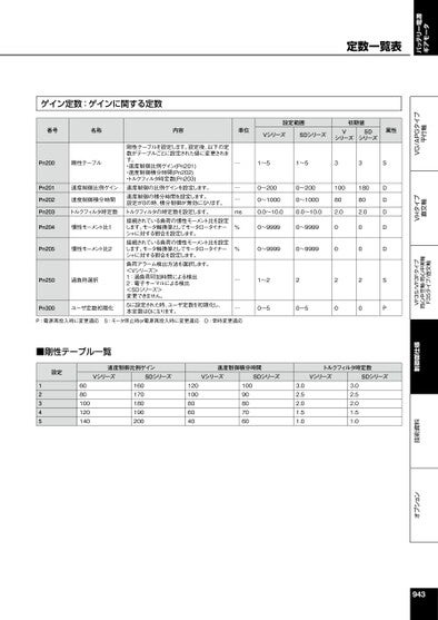 オプション技術資料制御部仕様VF3S/VF3Fタイプ同心中空軸・同心中実軸F3Sタイプ/直交軸VHタイプ直交軸VG/APGタイプ平行軸バッテリー電源ギアモータ定数一覧表ゲイン定数:ゲインに関する定数番号名称内容単位設定範囲初期値VシリーズSDシリーズVシリーズSDシリーズ属性Pn200剛性テーブルPn201Pn202Pn203速度制御比例ゲイン速度制御積分時間トルクフィルタ時定数Pn204慣性モーメント比1Pn205慣性モーメント比2Pn250過負荷選択Pn300ユーザ定数初期化剛性テーブルを設定します。設定後、以下の定数がテーブルごとに設定された値に変更されます。・速度制御比例ゲイン(Pn201)・速度制御積分時間(Pn202)・トルクフィルタ時定数(Pn203)速度制御の比例ゲインを設定します。速度制御の積分時間を設定します。設定が0の時、積分制御が無効になります。トルクフィルタの時定数を設定します。接続されている負荷の慣性モーメント比を設定します。モータ軸換算としてモータロータイナーシャに対する割合を設定します。接続されている負荷の慣性モーメント比を設定します。モータ軸換算としてモータロータイナーシャに対する割合を設定します。負荷アラーム検出方法を選択します。<Vシリーズ>1:過負荷印加時間による検出2:電子サーマルによる検出<SDシリーズ>変更できません。5に設定された時、ユーザ定数を初期化し、本定数は0になります。─1~51~533──ms%%──0~2000~2000~10000~10000.0~10.00.0~10.0100802.0180802.00~99990~99990~99990~99991~220~50~500200020SDDDDDSPP:電源再投入時に変更適応S:モータ停止時or電源再投入時に変更適応D:常時変更適応■剛性テーブル一覧設定速度制御比例ゲイン速度制御積分時間トルクフィルタ時定数VシリーズSDシリーズVシリーズSDシリーズVシリーズSDシリーズ123456080100120140160170180190200120100806040100908070603.02.52.01.51.03.02.52.01.51.0943