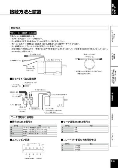 オプション技術資料制御部仕様VF3S/VF3Fタイプ同心中空軸・同心中実軸F3Sタイプ/直交軸VHタイプ直交軸VG/APGタイプ平行軸バッテリー電源ギアモータVシリーズ50W~0.4kW下図のように各機器を接続します。•ギアモータから出ているコードは0.5mです。•モータ信号線を延長する場合はオプションの延長コードをご使用ください。•オプション延長コードを継ぎ足して延長するときは、全長を4.5m(合計4本)までにしてください。•モータ強電線およびブレーキリード線の延長コードは用意していません。所定の線径P.916以上のコードを使い5m以内でお客様にて延長してください。モータ強電線の長さはできるだけ短くしてください。モータの特性が悪くなります。モータ信号線[0.5m]モータ強電線[0.5m]バッテリー電源タイプギアモータ延長コード[1m](オプション品)※延長コードの両端はコネクタが付いた状態で出荷されます。ブレーキリード線[0.3mAWG20](Dタイプのみ)■当社ドライバとの接続例PC接続ケーブル[1m](オプション)モータ信号線[0.5m]バッテリー電源タイプギアモータパソコンへ接続(RS-232C)制御機器へ接続I/Oケーブル[0.3m](ドライバ付属品)バッテリー電源へ接続クランプフィルタ(オプション)モータ強電線[0.5m]ブレーキリード線[0.3mAWG20]Dタイプのみ)ブレーキ電源へ接続945■モータ強電線の色と信号名線の色赤白黒U相V相W相内容■ブレーキリード線の色と電圧仕様線の色黄白橙12V仕様24V仕様48V仕様電圧モータ信号線と強電線■信号線の色と信号名線の色紫橙緑緑/白灰機能ポールセンサ用電源(当社ドライバでは15V)U相ポール信号出力(オープンコレクタ)V相ポール信号出力(オープンコレクタ)W相ポール信号出力(オープンコレクタ)GND■コネクタピン配置緑橙紫緑/白灰日本圧着端子製造XAP-05V-1接続方法と設置接続方法