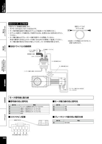 VG/APGタイプ平行軸VHタイプ直交軸VF3S/VF3Fタイプ同心中空軸・同心中実軸F3Sタイプ/直交軸制御部仕様技術資料オプションバッテリー電源ギアモータSDシリーズ0.75kW下図のように各機器を接続します。•ギアモータから出ているコードは0.5mです。•モータ信号線を延長する場合はオプションの延長コードをご使用ください。•オプション延長コードを継ぎ足して延長するときは、全長を4.5m(合計4本)までにしてください。•モータ動力線およびブレーキリード線の延長コードは用意していません。所定の線径P.916以上のコードを使い5m以内でお客様にて延長してください。モータ動力線の長さはできるだけ短くしてください。モータの特性が悪くなります。■当社ドライバとの接続例延長コード[1m](オプション品)※延長コードの両端はコネクタが付いた状態で出荷されます。PC接続ケーブル[1m]パソコンへ接続(RS-232C)制御機器へ接続I/Oケーブル[0.3m]モータ信号線[0.5m]モータ動力線[0.5m]バッテリー電源へ接続クランプフィルタ(オプション)モータ信号線と動力線■信号線の色と信号名線の色黄赤白黒緑機能ポールセンサ用電源(当社ドライバでは15V)U相ポール信号出力(オープンコレクタ)V相ポール信号出力(オープンコレクタ)W相ポール信号出力(オープンコレクタ)GND■コネクタピン配置1番端子切欠きブレーキリード線[0.3mAWG22](ブレーキ付のみ)■モータ動力線の色と信号名線の色赤白黒U相V相W相内容■ブレーキリード線の色と電圧仕様線の色茶48V仕様電圧黄赤白黒緑日本圧着端子製造XAP-05V-1946
