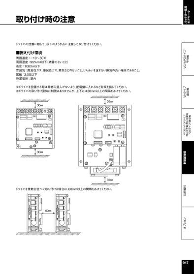 オプション技術資料制御部仕様VF3S/VF3Fタイプ同心中空軸・同心中実軸F3Sタイプ/直交軸VHタイプ直交軸VG/APGタイプ平行軸バッテリー電源ギアモータ取り付け時の注意ドライバの設置に際して、以下のような点に注意して取り付けてください。■据え付け環境周囲温度:-10~50℃周囲湿度:95%RH以下(結露のないこと)高度:1000m以下雰囲気:腐食性ガス、爆発性ガス、蒸気などのないこと、じんあいを含まない換気の良い場所であること。振動:2.0G以下設置場所:屋内※ドライバを設置する際は異物の混入がないよう、配電盤に入れるなど対策を施してください。※ドライバの取り付け姿勢に制限はありませんが、上下には30mm以上の間隔をあけてください。30㎜30㎜30㎜30㎜ドライバを複数台並べて取り付ける場合は、60mm以上の間隔をあけてください。60㎜947