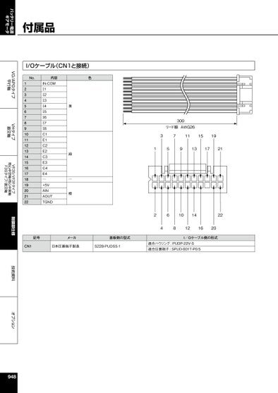 VG/APGタイプ平行軸VHタイプ直交軸VF3S/VF3Fタイプ同心中空軸・同心中実軸F3Sタイプ/直交軸制御部仕様技術資料オプションバッテリー電源ギアモータ付属品I/Oケーブル(CN1と接続)No.内容色12345678910111213141516171819202122IN-COMⅠ1Ⅰ2Ⅰ3Ⅰ4Ⅰ5Ⅰ6Ⅰ7Ⅰ8C1E1C2E2C3E3C4E4─+5VAINAOUTTGND黄緑─橙300リード線AWG26371115191591317212610142248121620記号メーカ基板側の型式I/Oケーブル側の形式CN1日本圧着端子製造S22B-PUDSS-1適合ハウジング:PUDP-22V-S適合圧着端子:SPUD-001T-P0.5948