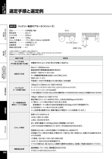 VG/APGタイプ平行軸VHタイプ直交軸VF3S/VF3Fタイプ同心中空軸・同心中実軸F3Sタイプ/直交軸制御部仕様技術資料オプションバッテリー電源ギアモータ選定手順と選定例選定例バッテリー電源ギアモータ(Vシリーズ)用途…………………台車駆動(4輪)最高速度……………2km/hタイヤ外径…………200mm全重量………………100kgO.H.L.の荷重点……フランジ面から150mm(右図参照)稼働時間……………10時間以上/日起動頻度……………70回/日以下車輪の抵抗係数……0.12km/hタイヤ外径200mm全重量100kg150※別売りの専用ドライバを使用した場合の選定例です。当社ホームページ計算選定ツールをご利用ください。https://sentei.nissei-gtr.co.jp/calculation)使用条件・シリーズを入力すると、WEB上で容量計算が可能です。選定の手順タイプの決定(平行軸・直交軸・中空軸)減速比の決定選定例車軸取り付けにより、VF3S(同心中空軸)に決定する。2km/h=33333mm/min最高速度時の駆動軸回転速度を求めます。33333÷(200×π)=53.1r/minモータ軸最高回転速度は2500r/minであることから2500÷53.1=47.1可変速モータなので計算値より小さ目の速比1/40を選択トルクおよびモータ容量の検討100kg×0.1×(200mm÷2÷1000)×Sf×9.8サービスファクタ(Sf)を1.25とすると上式は12.25N・mとなります。※1/40の減速比で12.25N・m以上の出力軸許容トルクがあるものは0.1kW以上の容量のものになります。(サービスファクターはP.954参照)モータ軸換算負荷慣性モーメントの検討100kg×(200mm÷2÷1000)2×i2×C補正係数(C)に1、iに1/40を代入すると、上式は0.000625kg・m2となります。※(慣性モーメントの補正係数はP.955[表-2]参照)許容慣性モーメント表から100Wの許容値は0.00125kg・m2なので許容値内です。※※(許容慣性モーメント表はP.955[表-3]参照)(上記計算は簡便のため、車輪や軸などの慣性モーメントを無視しています。)負荷トルクによるO.H.L.は12.25÷(200÷2÷1000)上式は、122.5Nとなります。また、台車の重量の1/4の25kg245N)が直接軸にかかります。この2つの力は90゜の角度をなしているので、その合成力は274Nとなります。O.H.L.の検討性能表から0.1kW、1/40の中空軸タイプの許容O.H.L.は830Nです。中空軸のフランジ取付けの場合(片側をピローで受けない時)、許容O.H.L.を補正する必要があります。※P.958参照この場合、(55+20)÷(55+150)×830=303したがって、303>274となり許容値内です。※ベルトの張力など、他にもO.H.L.に影響する要素がある場合は、お客様にて数値の追加を行ってください。機種選定結果選定機種は、ブレーキなし・電源電圧を24VとするとVF3SC15-40N100L2Aとなります。952