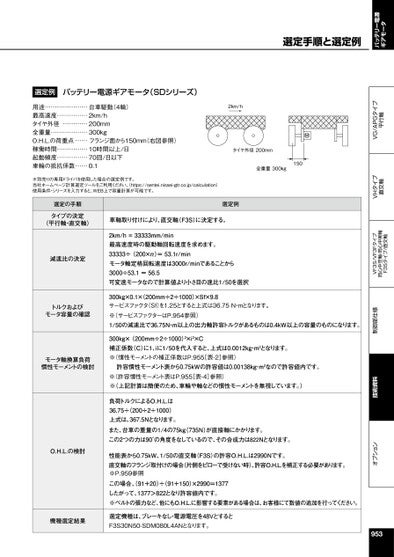 オプション技術資料制御部仕様VF3S/VF3Fタイプ同心中空軸・同心中実軸F3Sタイプ/直交軸VHタイプ直交軸VG/APGタイプ平行軸バッテリー電源ギアモータ選定例バッテリー電源ギアモータ(SDシリーズ)用途…………………台車駆動(4輪)最高速度……………2km/hタイヤ外径…………200mm全重量………………300kgO.H.L.の荷重点……フランジ面から150mm(右図参照)稼働時間……………10時間以上/日起動頻度……………70回/日以下車輪の抵抗係数……0.12km/hタイヤ外径200mm全重量300kg150※別売りの専用ドライバを使用した場合の選定例です。当社ホームページ計算選定ツールをご利用ください。https://sentei.nissei-gtr.co.jp/calculation)使用条件・シリーズを入力すると、WEB上で容量計算が可能です。選定の手順タイプの決定(平行軸・直交軸)減速比の決定選定例車軸取り付けにより、直交軸(F3S)に決定する。2km/h=33333mm/min最高速度時の駆動軸回転速度を求めます。33333÷(200×π)=53.1r/minモータ軸定格回転速度は3000r/minであることから3000÷53.1=56.5可変速モータなので計算値より小さ目の速比1/50を選択トルクおよびモータ容量の確認300kg×0.1×(200mm÷2÷1000)×Sf×9.8サービスファクタ(Sf)を1.25とすると上式は36.75N・mとなります。※1/50の減速比で36.75N・m以上の出力軸許容トルクがあるものは0.4kW以上の容量のものになります。(サービスファクターはP.954参照)モータ軸換算負荷慣性モーメントの検討300kg×(200mm÷2÷1000)2×i2×C補正係数(C)に1、iに1/50を代入すると、上式は0.0012kg・m2となります。※(慣性モーメントの補正係数はP.955[表-2]参照)許容慣性モーメント表から0.75kWの許容値は0.00138kg・m2なので許容値内です。(許容慣性モーメント表はP.955表-4]参照)※※(上記計算は簡便のため、車輪や軸などの慣性モーメントを無視しています。)負荷トルクによるO.H.L.は36.75÷(200÷2÷1000)上式は、367.5Nとなります。O.H.L.の検討また、台車の重量の1/4の75kg(735N)が直接軸にかかります。この2つの力は90゜の角度をなしているので、その合成力は822Nとなります。性能表から0.75kW、1/50の直交軸(F3S)の許容O.H.L.は2990Nです。直交軸のフランジ取付けの場合(片側をピローで受けない時)、許容O.H.L.を補正する必要があります。※P.959参照この場合、91+20)÷(91+150)×2990=1377したがって、1377>822となり許容値内です。※ベルトの張力など、他にもO.H.L.に影響する要素がある場合は、お客様にて数値の追加を行ってください。機種選定結果選定機種は、ブレーキなし・電源電圧を48VとするとF3S30N50-SDM080L4ANとなります。953