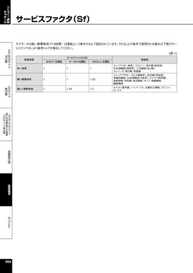 VG/APGタイプ平行軸VHタイプ直交軸VF3S/VF3Fタイプ同心中空軸・同心中実軸F3Sタイプ/直交軸制御部仕様技術資料オプションバッテリー電源ギアモータサービスファクタ(Sf)ギアモータは軽い衝撃負荷で10時間/日運転という条件のもとで設計されています。それ以上の条件で使用される場合は下表のサービスファクタにより負荷トルクを補正してください。負荷状態均一負荷軽い衝撃負荷激しい衝撃負荷111サービスファクタ(Sf)3H以下/日運転3~10H/日運転10H以上/日運転用途例[表-1]111.2511.251.5コンベア(均一負荷)、スクリーン、混合機(低粘度)、水処理機械(軽負荷)、工作機械(送り軸)、エレベータ、押出機、蒸留機コンベア(不均一、または重負荷)、混合機(高粘度)、車輛用機械、水処理機械(中負荷)、ホイスト(軽荷重)、製紙機械、供給機、食品機械、ポンプ、精糖機械、繊維機械ホイスト(重荷重)、ハンマーミル、金属加工機械、クラッシャ、タンブラ954