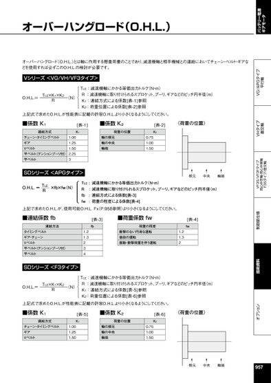 オプション技術資料制御部仕様VF3S/VF3Fタイプ同心中空軸・同心中実軸F3Sタイプ/直交軸VHタイプ直交軸VG/APGタイプ平行軸バッテリー電源ギアモータオーバーハングロード(O.H.L.)オーバーハングロード(O.H.L.)とは軸に作用する懸垂荷重のことであり、減速機軸と相手機械との連結においてチェーン・ベルト・ギアなどを使用すれば必ずこのO.H.L.の検討が必要です。Vシリーズ<VG/VH/VF3タイプ>O.H.L.=TLE×K1×K2R(N)TLE:減速機軸にかかる等価出力トルク(N・m)R:減速機軸に取り付けられるスプロケット、プーリ、ギアなどのピッチ円半径(m)K1:連結方式による係数[表-1]参照K2:荷重位置による係数[表-2]参照上記式で求めたO.H.L.が性能表に記載の許容O.H.L.より小さくなるようにしてください。■係数K1■係数K2[表-1][表-2]連結方式K1荷重の位置1.00チェーン・タイミングベルト1.25ギア1.50Vベルト平ベルト(テンションプーリ付)2.25平ベルト3SDシリーズ<APGタイプ>軸の根元軸の中央軸端K20.751.001.50〈荷重の位置〉根元中央軸端上記式で求めたO.H.L.が性能表に記載の許容O.H.L.より小さくなるようにしてください。■係数K1■係数K2[表-5][表-6]連結方式チェーン・タイミングベルトギアVベルトK11.001.251.50荷重の位置軸の根元軸の中央軸端K20.751.001.50〈荷重の位置〉根元中央軸端957減速機軸にかかる等価出力トルク(N・m)減速機軸に取り付けられるスプロケット、プーリ、ギアなどのピッチ円半径(m)連結方式による係数[表-3]荷重の程度による係数[表-4]::::TLERfbfwO.H.L.=TLER×fb×fw(N)上記で求めたO.H.L.が、使用可能O.H.L.FxP.958参照)より小さくなるようにしてください。■連結係数fb■荷重係数fw[表-3]連結方法fbタイミングベルトギア・チェーンVベルト平ベルト(テンションプーリ付)平ベルト1.21.3234荷重の程度衝撃のない円滑な運転普段の運転振動・衝撃荷重を伴う運転1.21.32[表-4]fwSDシリーズ<F3タイプ>O.H.L.=TLE×K1×K2R(N)TLE:減速機軸にかかる等価出力トルク(N・m)R:減速機軸に取り付けられるスプロケット、プーリ、ギアなどのピッチ円半径(m)K1:連結方式による係数[表-5]参照K2:荷重位置による係数[表-6]参照
